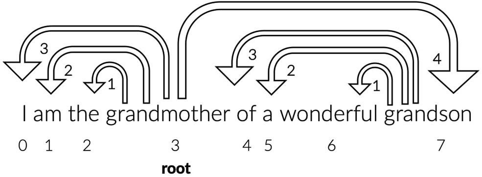 The dependency parsing of the sentence “I am the grandmother of a wonderful grandson” is depicted. The ids of the words, representing the position of the words in the sentence, are indicated with numbers 0–7 and the word “grandmother” is identified by the parser as the root word. The arrows have the direction from the head/root word to the dependent/children, the dependency distance between the pair is indicated on the arrow head and equals the difference of their id values. The words “the,” “am,” “I,” and “grandson” are dependent from the word “grandmother” and the words “wonderful,” “a,” and “of” are dependent from the word “grandson.” The MDD of this sentence based on the Equation (11) equals (3+2+1+4+3+2+1)/7= 2.28.