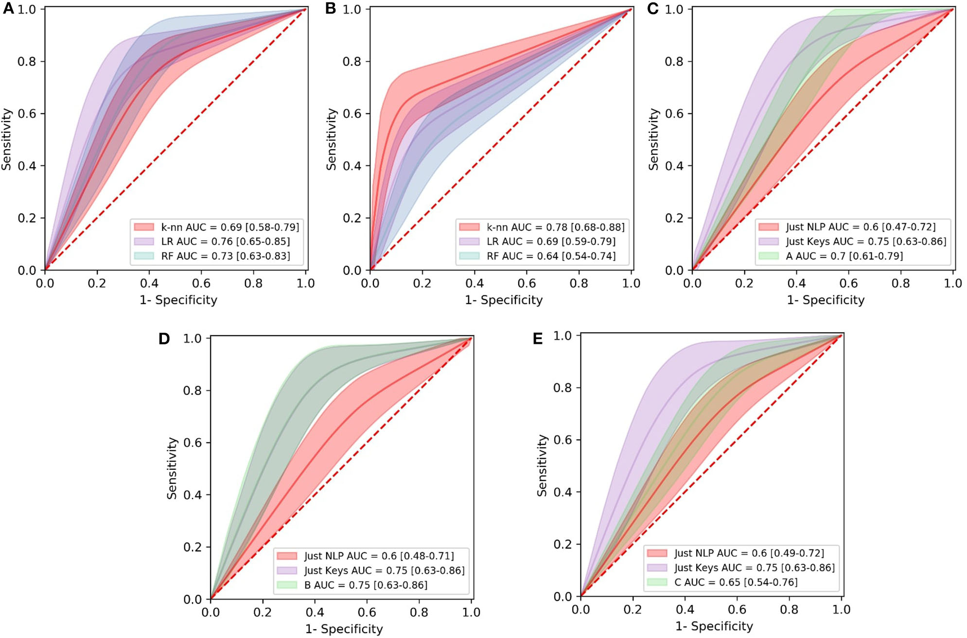In order to address the study research questions, that is, the exploration of the classification performance between MCI and HC, using features drawn from the NLP, keystroke dynamics, and combined feature spaces, three experiments, i.e., EXP1, EXP2, and EXP3, with different feature sets and demographically matched sub-cohorts were conducted, accordingly. In each experiment, three different classifiers, Logistic Regression, Random Forest, and k-Nearest Neighbors are evaluated based on their accuracy and the receiver operating characteristic (ROC) analysis, after multiple rounds of LOSO cross-validation. ROC analysis is an iterative process of varying the discrimination threshold of a binary classifier and outputting the (Sensitivity, Specificity) pair for each threshold. The ROC curve is then formed by plotting the output pairs of (1—Specificity, Sensitivity). This analysis provides reliable insights into the performance of a classification model even when datasets are not completely balanced. To assess the statistical significance of classification results, sampling with replacement (1,000 bootstraps) is further used here to define a ROC curve distribution, by obtaining the average value (solid line in figures) and the confidence intervals (shadowed areas in the figures) of the area under the ROC curve (AUC). Where reported, specificity/sensitivity values correspond to the optimal ROC-based cut-off point (decision threshold), estimated by maximizing the Youden Index (48), for equal cost of misclassifying MCI patients and HC. A Univariate Feature Selection process was used, where each feature was individually assessed with regards to its statistical significance with the label and combinations of the features with the highest correlation were chosen for the optimal feature set in each experiment. Standardization and scaling was performed in the feature sets when needed, by removing the mean and scaling to unit variance. An overview of the pipeline and the different experiments and cohorts can be seen in Figure 3.