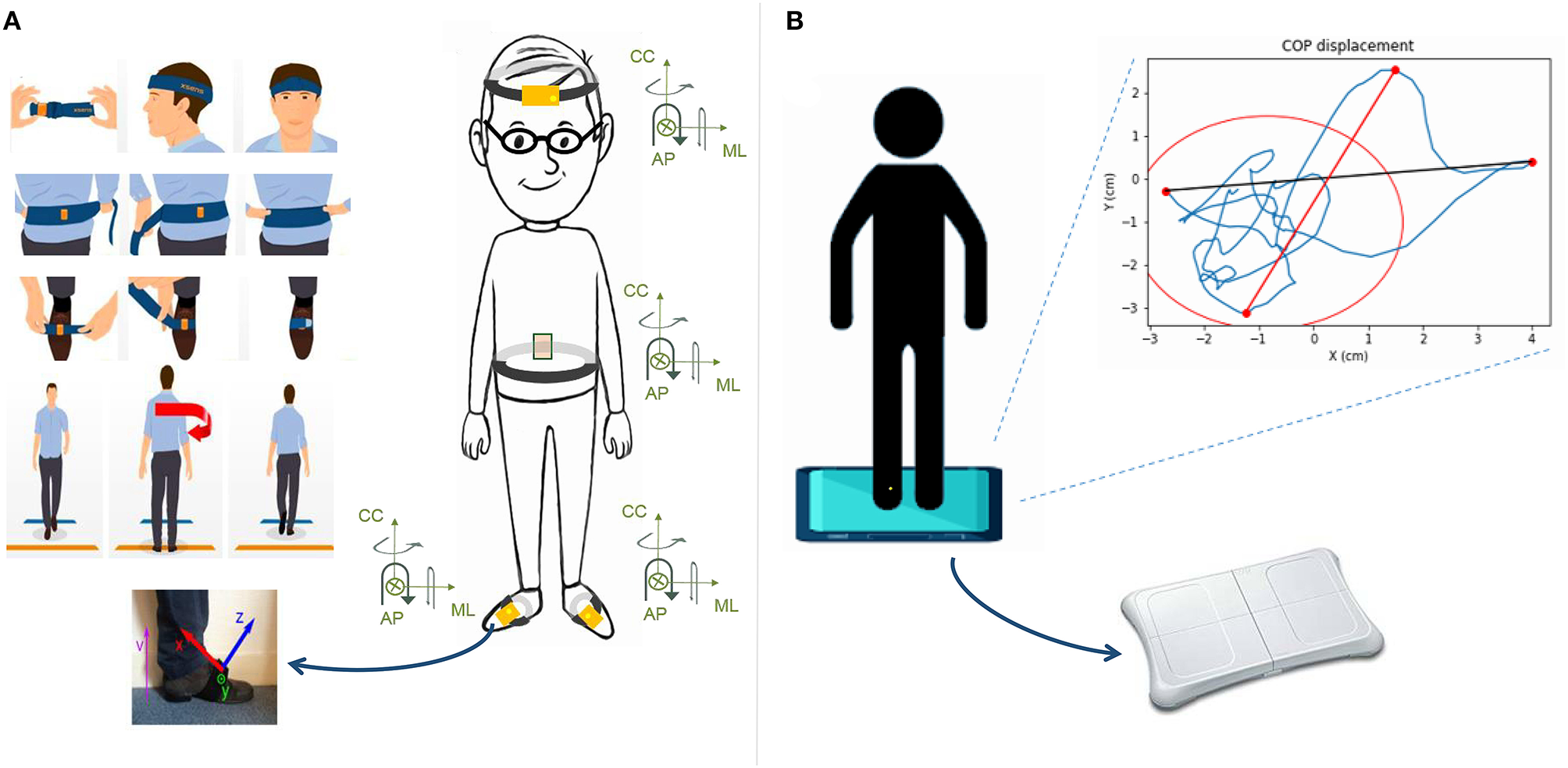 Measurement process for balance analysis. (A) For gait analysis: Four sensors are placed on the top of each foot, on the low back, and on the front of the resident.They are asked to walk 10 m, make a U-turn and come back to the start line. The orientation of each IMU is indicated. (B) For quiet stance analysis: The force platform is a Wii Balance Board on which the participant stands and remains as still as possible for two periods of 25 s (eyes open and eyes closed). The signal of the COP trajectory is then recorded and automatically analyzed.