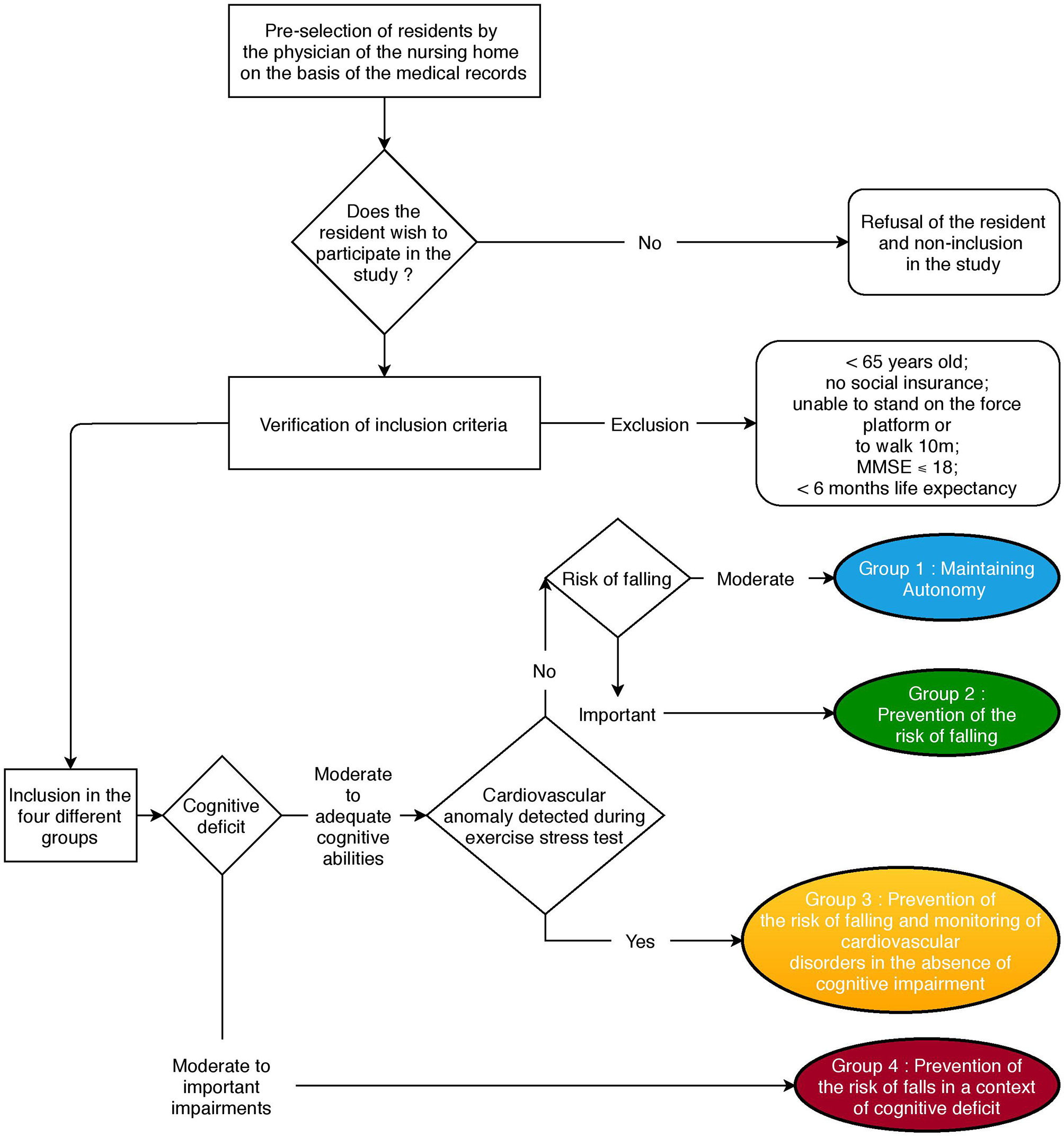 To summarize the allocation of participants in each group, from the list proposed by the coordinating physician of the nursing home, people are informed about the implementation of the clinical trial in their residence. They obtain the information note and are informed about the study by the clinical trial investigator. They are then assessed using the ORAS form to look for cognitive deficits that will lead to their inclusion in group 4. If the cognitive deficits are limited, the screening for cardiovascular anomalies allows them to be referred to group 3 if necessary. If there are no cardiovascular anomalies during the stress test, and depending on their risk of falling as determined via the ORAS form, participants are allocated to either group 2 or group 1, if their risk of falling is considered high or moderate, respectively (Figure 2).