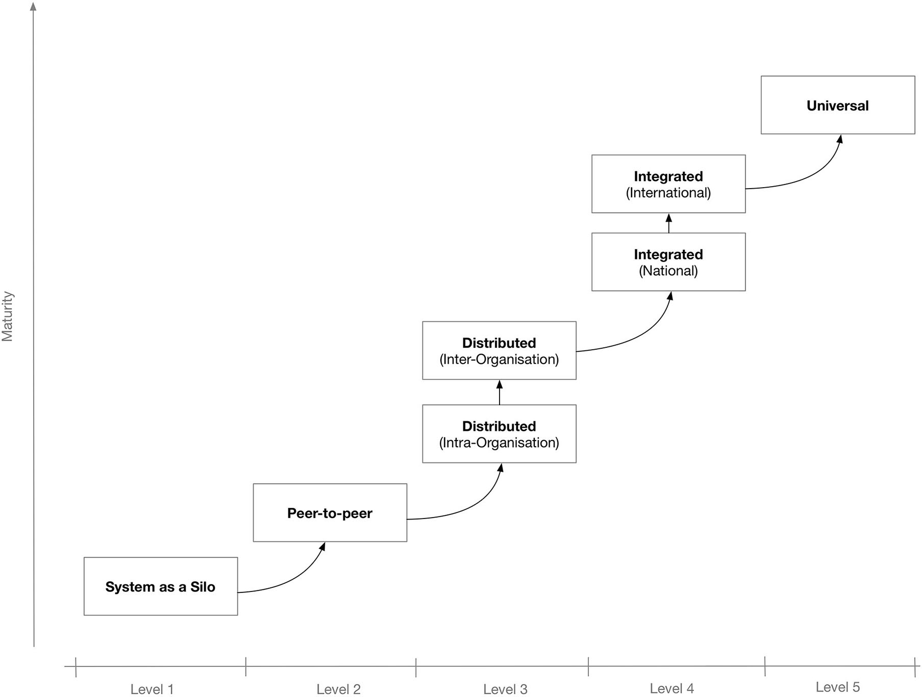 To better secure the IT system's potential for interconnectivity and cooperation with other systems, the use of interoperable technologies and standards is needed. Depending on the extent and scope of the envisaged shared information spaces, there may be different levels of interoperability. Figure 1 shows a proposed “maturity” model for interoperability in eHealth (4). The model consists of five levels that, incrementally, describe a more mature version of an interoperable infrastructure, starting from Level 1 for non-connected eHealth applications; Level 2 where a single eHealth application is directly linked to another application for simple data exchange (5); Level 3 for distributed systems that agree on protocols used, data formats, message exchange patterns (6), etc.; Level 4, where eHealth applications from different suppliers that serve a common goal are linked but the applications do not need to have common objectives (7); and finally, at the “universal” Level 5, where diverse eHealth applications connect to an open, interoperable infrastructure possibly spanning multiple countries (8, 9).