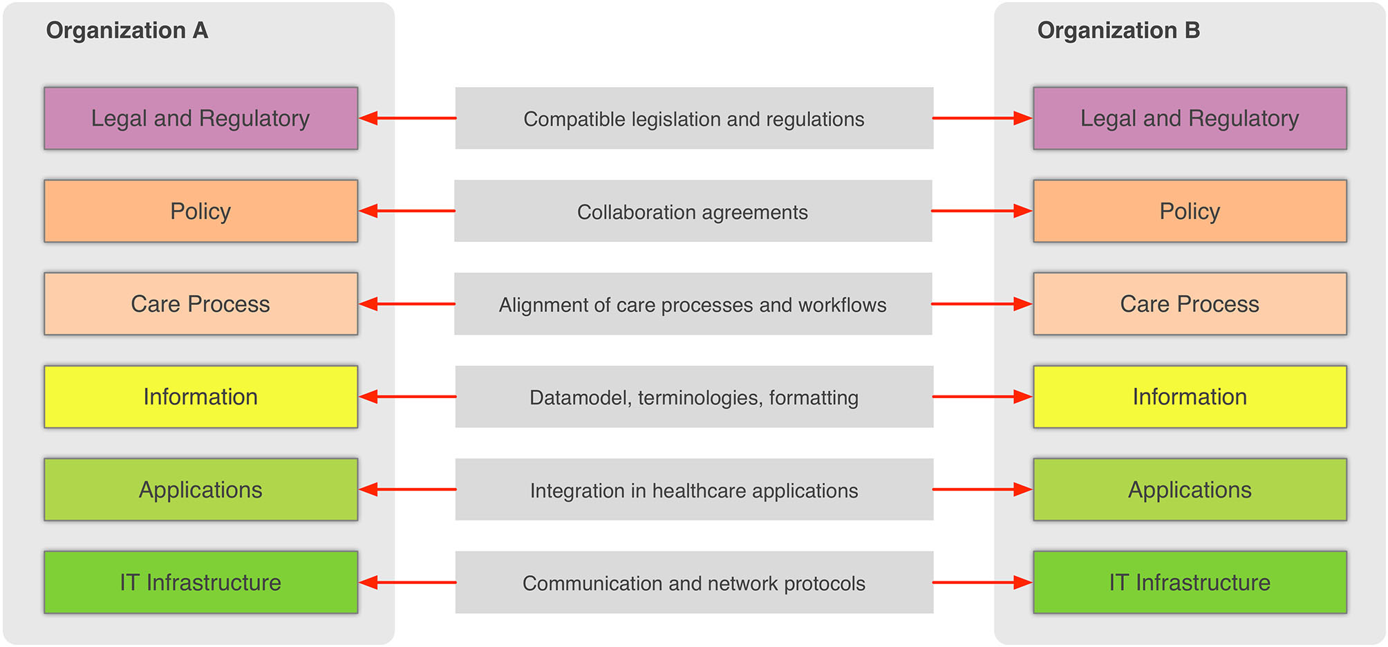 This framework provides a great overview of the needed “glue” so that two or more health-care environments can collaborate and serve as a common, multilevel, and multi-perspective model on the interoperability requirements. The six different levels of the (refined) EIF are the following: