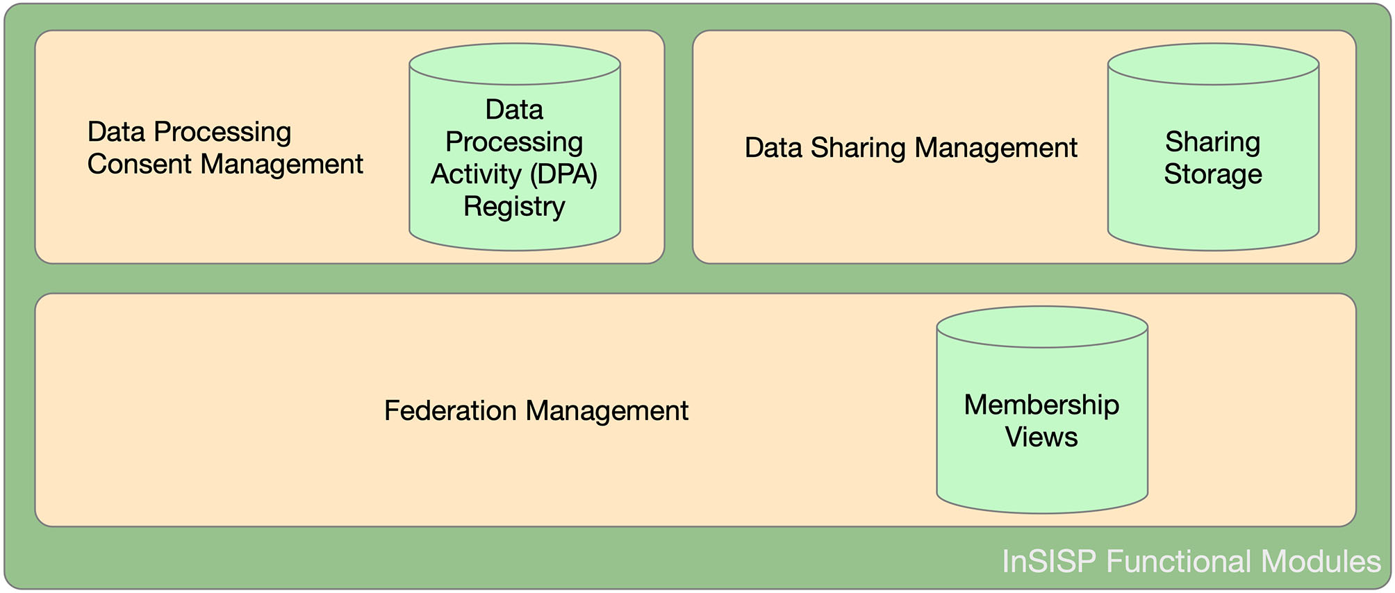 From an abstract point of view, InSISP can be seen as a data repository that can be accessed by HCOs (i.e., clients) to store and retrieve shared data by using a common interface and format (e.g., CDA Release 2 using standard vocabularies such as SNOMED and LOINC). The shared data repository is surrounded by a federation of collaborating entities (organizations/clients) that is dynamic and evolving. Once the federation is established, participating entities can start sharing data according to the data processing consent provided by patients. To this aim, we can identify two additional functionalities: (i) data sharing and (ii) data processing consent management. Figure 5 summarizes a possible decomposition of the InSISP and highlights the three storage components.