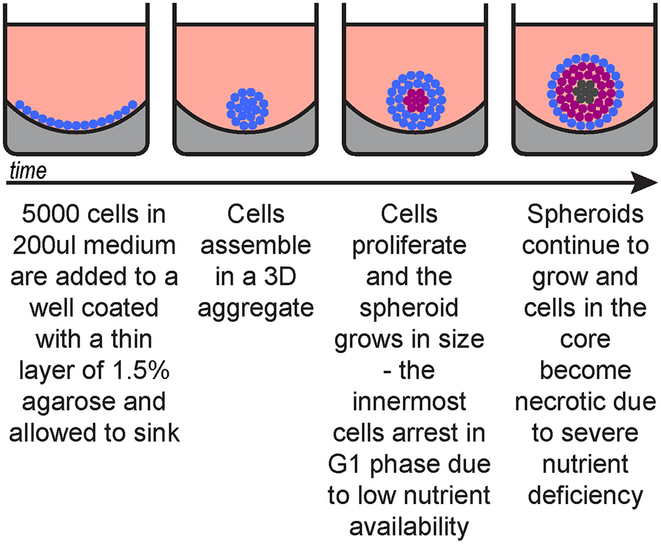 Spheroid generation timeline. Blue, cycling cells; magenta, G1-arrested cells; dark grey, necrotic cells.