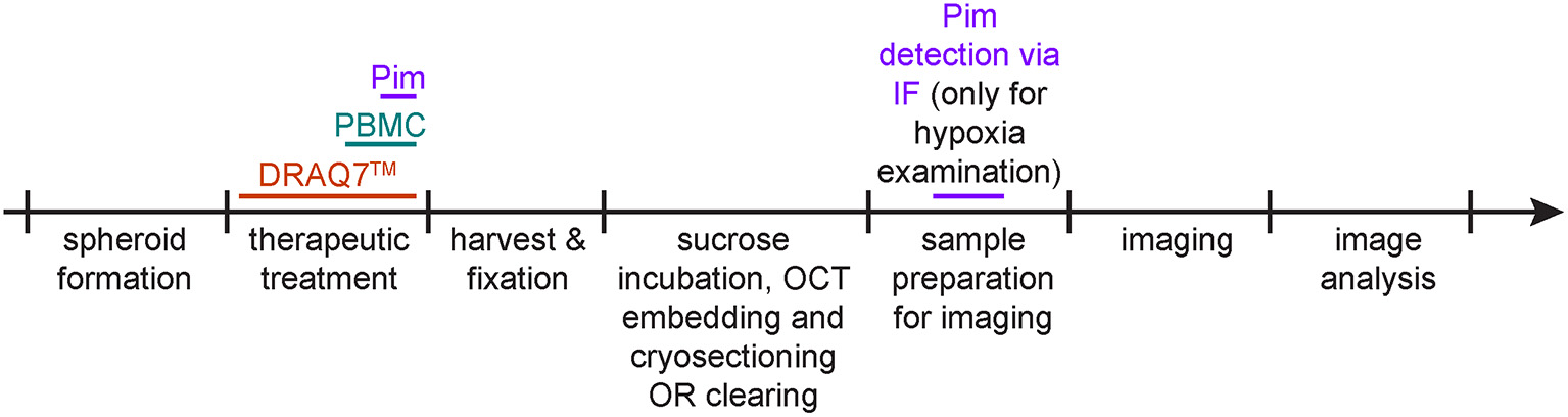 Protocol schematic. Spheroid treatment timeline for detection of hypoxia via pimonidazole staining (purple), of cell death via DRAQ7™ (orange) and of infiltrating PBMCs (aquamarine).