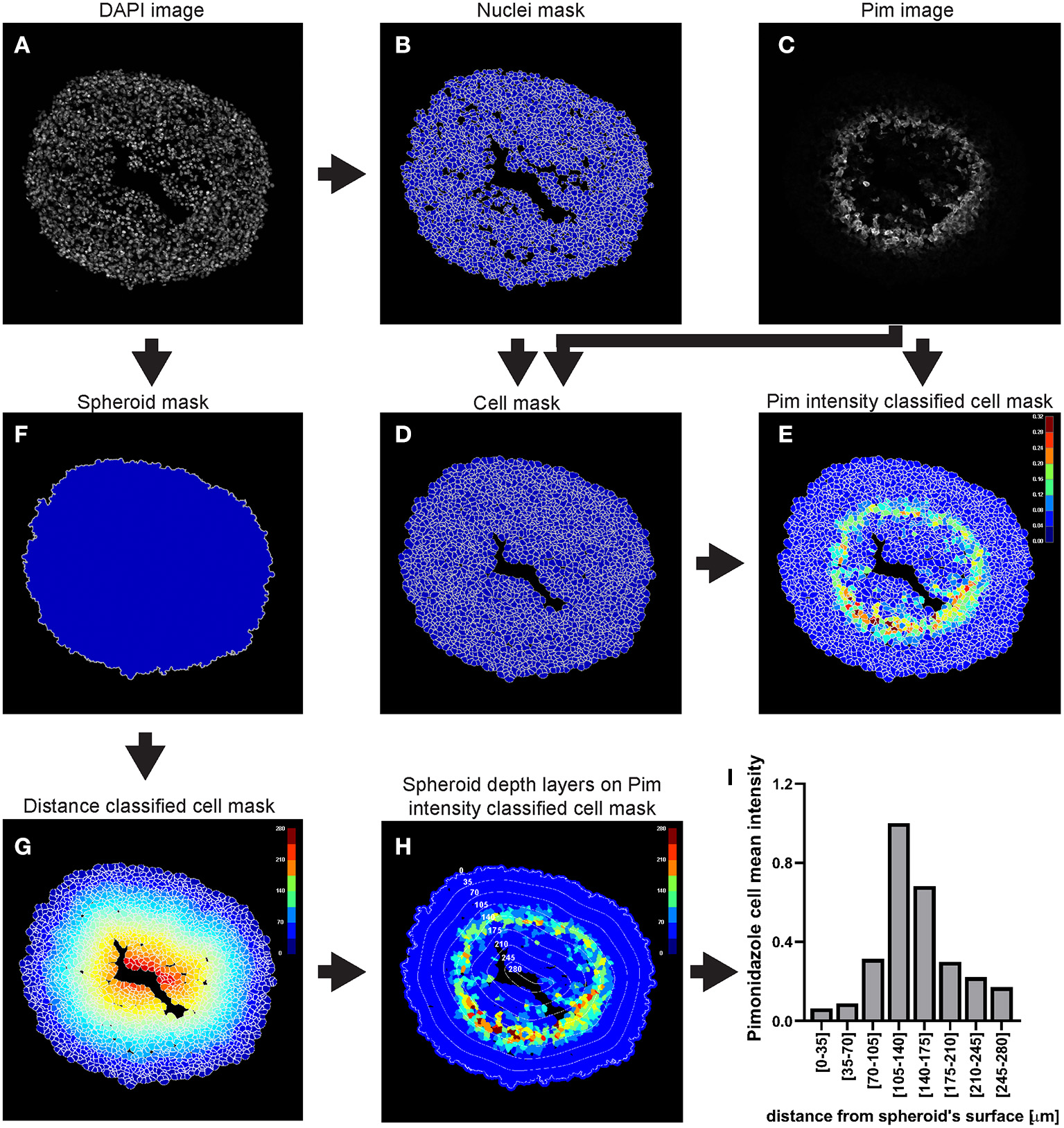 In conclusion, we describe a protocol where spheroids are used as fast, inexpensive and reproducible in vitro tumour model to quantitatively and spatially examine biological events that are important for cancer prognosis and therapy outcome. We outline this procedure for tumour hypoxia, cell death and immune cell infiltration. Detection of these processes via fluorescence microscopy in spheroid cryosections produces excellent image quality for accurate and automated analysis employing user-friendly, open-source Fiji-ImageJ and CellProfiler software. We propose an explorative application of these techniques to assist personalised medicine based on functional assessment and therefore independently form biomarkers.