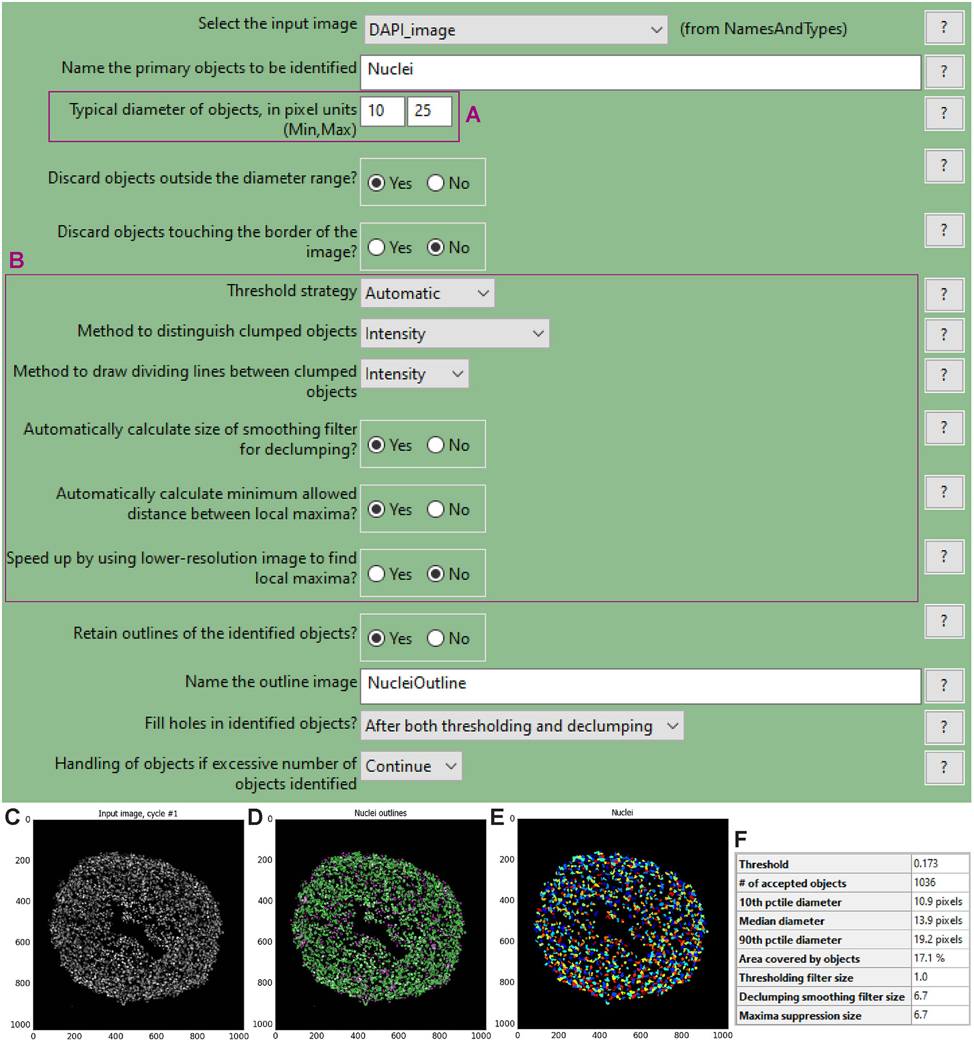 Add and combine “ClassifyObjects,” “OverlayOutlines,” and “SaveImages” modules to generate images for visual analysis and illustration purposes (Figures 12B,D,E).