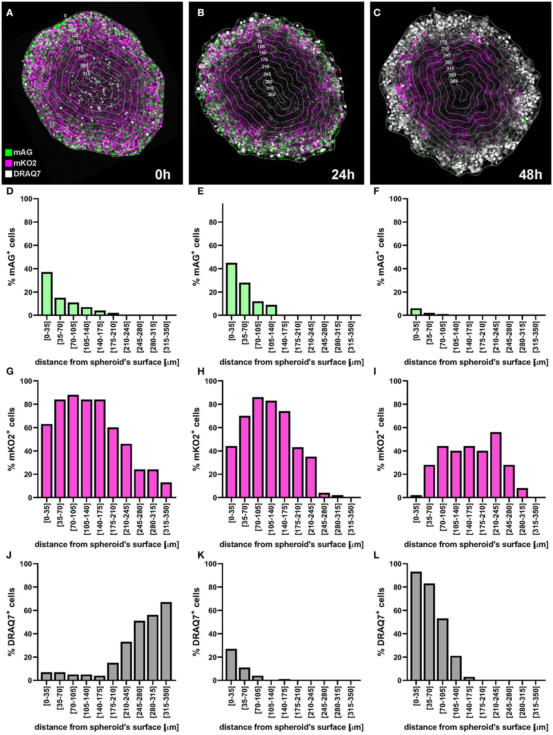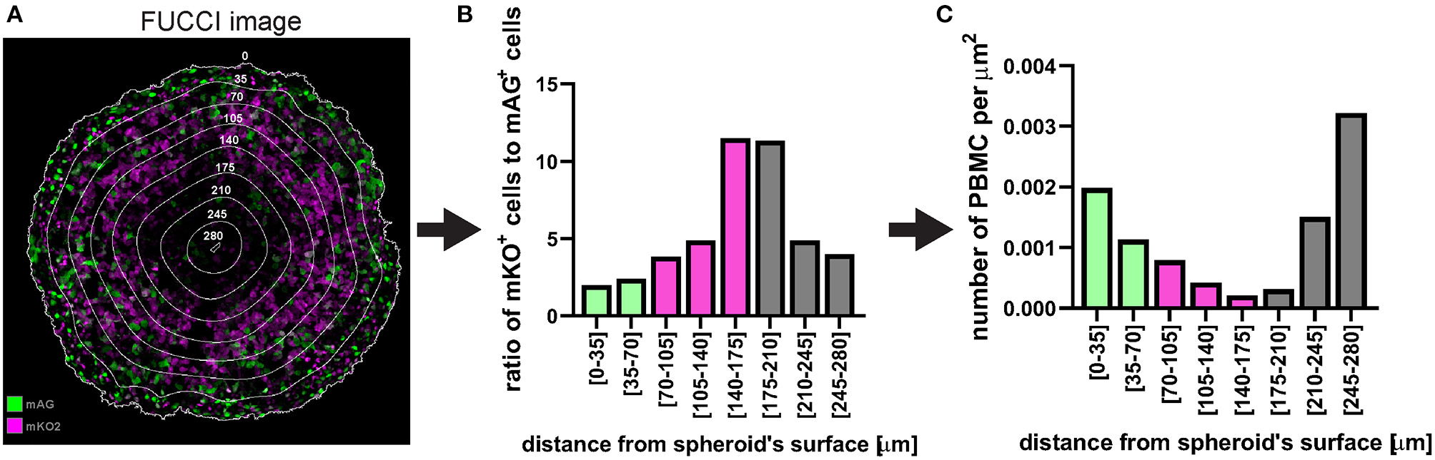Example of application of fluorescent spheroid-infiltrating PBMC spatial detection analysis. (A) FUCCI fluorescence image of the same spheroid section as in Figure 12 with the same distance rings. A mixture of mAG and mKO2 positive cells designates areas of proliferation whereas G1-arrest occurs in zones with increased proportion of mKO2 positive cells. (B) Ratio of mKO2 positive cells to mAG positive cells plotted as a function of the distance from the spheroid surface. When this ratio is low it indicates proliferation and when it increases it implies occurrence of G1-arrest. Bar colours were assigned based on visual inspection of (A). Green, proliferation; magenta, G1-arrest; and grey, cell death. Decreased ratio in the necrotic core may be an artefact due to dead cells loosing FUCCI fluorescence. (C) Same PBMC infiltration profile as in Figure 12F where bars (spatial bins) have been colour-coded according to the heterogeneous cell populations identified in (A,B).