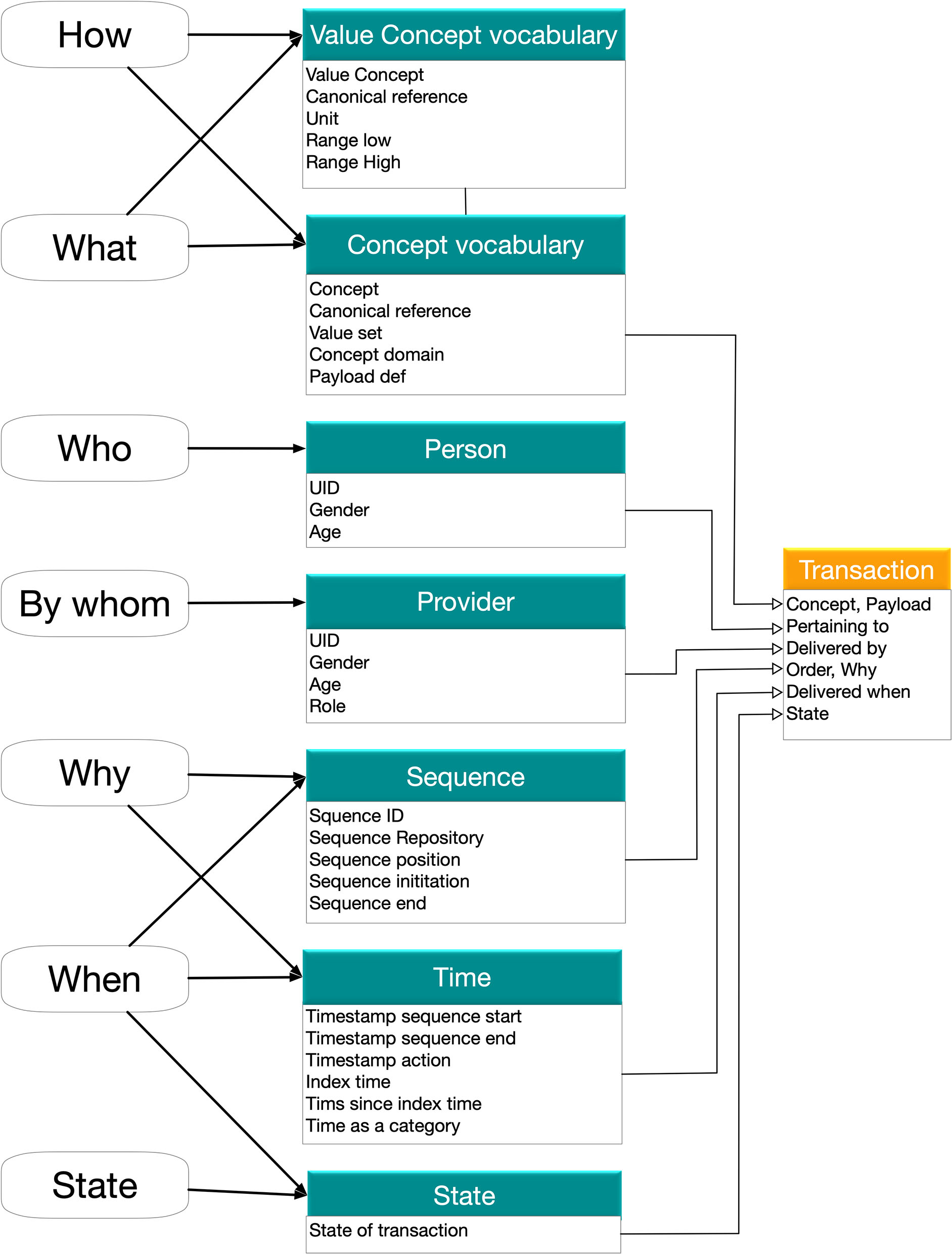 The information model for the single transaction that represents the lowest level of analysis. The necessary semantic dimensions are represented in two levels with the concept level (What/How/Who) and the sequencing level (By whom, why, when, state). All this can be represented in common standards such as FHIR Observation. The two-level model limits the need for the most complex SNOMED CT concepts (see text). A set of planned transactions with the state marked as planned and scheduling (times in the future) is the content of a careplan.