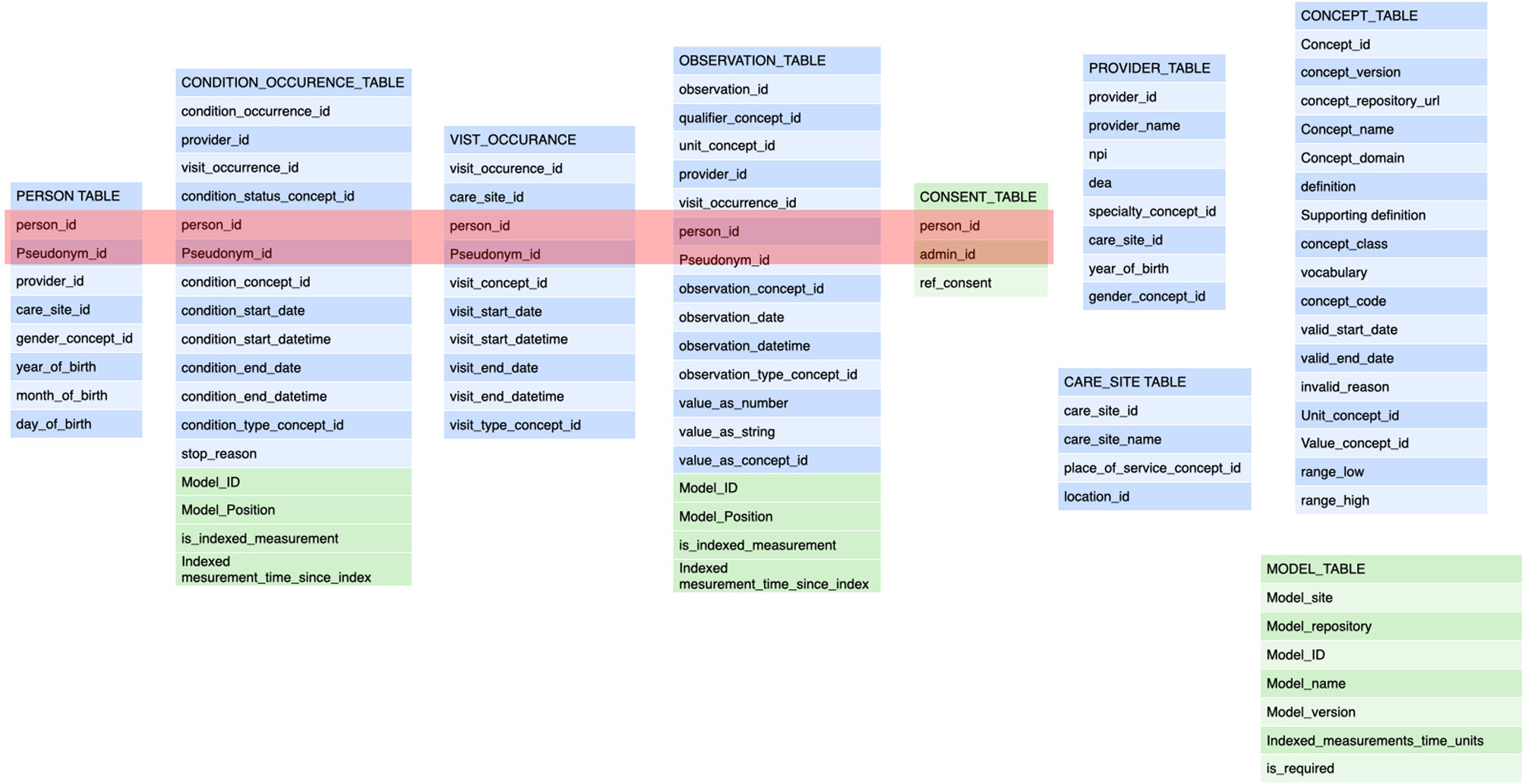 These are the tables for the annotation of a transaction. The tables refer back to the general annotation that is dictated by the information model (Figure 2). The tables adhere to the FHIR Observation resource and are derived from the OMOP data model (blue components). The modifications from the FHIR resources pertain to the collapsing of tables from FHIR observation, FHIR measurement, FHIR procedure to a single table as that implies semantic content that is determined at the transaction level. Also, the specific reference to the semantic level 2 (the care plan level) including the site in the plan is an important addition (depicted in green). This amendment allows the data to be fully anonymised by removing the links to a single person and the linking along the time domain. The data may still be used for e.g. outcomes estimations. See Figure 4. The embedding of clinical studies in clinical routine also necessitated the annotation of the informed consent status to properly manage the extraction of research data. It should be noted tha t this annotation carries both the information on the concept level as well as all necessary information on the sequence level (care plan level).