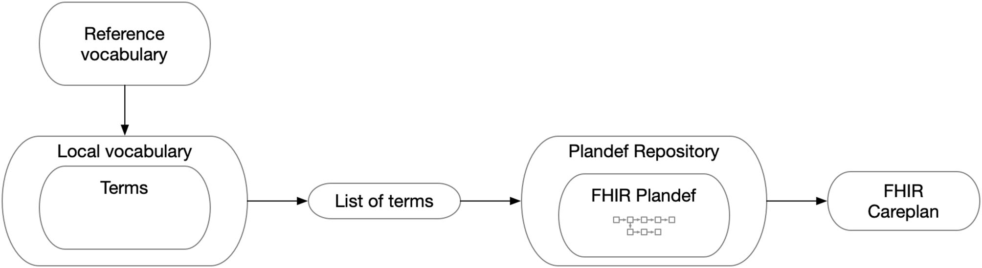 The general map of how the FHIR Careplan was constructed. Thus, FHIR observations generated on the basis of the individual care plan have information on vocabulary and its related value concepts as well as plan origin and placement in the plan. From this, all semantic information can be reconstructed for analytical purposes.
