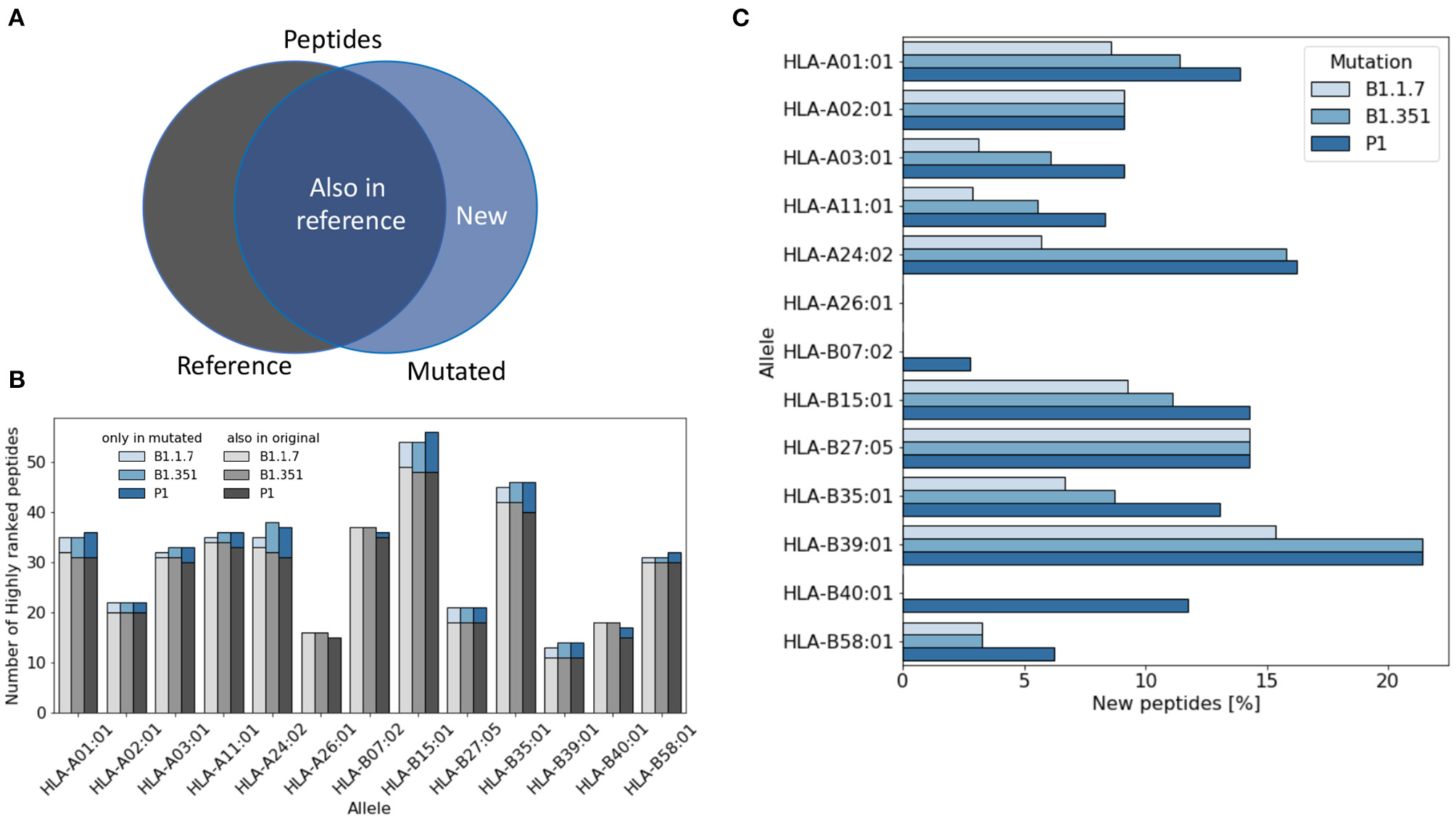 For each virus variant, we obtain a list of highly ranked peptides that are most likely to be potential epitopes recognized by T cells. We then compare these lists with the list obtained from the reference virus and count how many potential were already present in the reference virus (Figure 1A). Figure 1B shows that the total number of potential epitopes varies only slightly for different virus variants and slightly more when comparing different HLA alleles. As illustrated in Figure 1C, the percentage of new peptides not present in the reference virus varies in the range of 0–20% depending on the HLA allele. The lowest rate of variations is found for HLA-A26 for which all the potential epitopes were already present in the reference virus, while the highest variation rate is found for HLA-B39, with more than 20% of new epitopes.