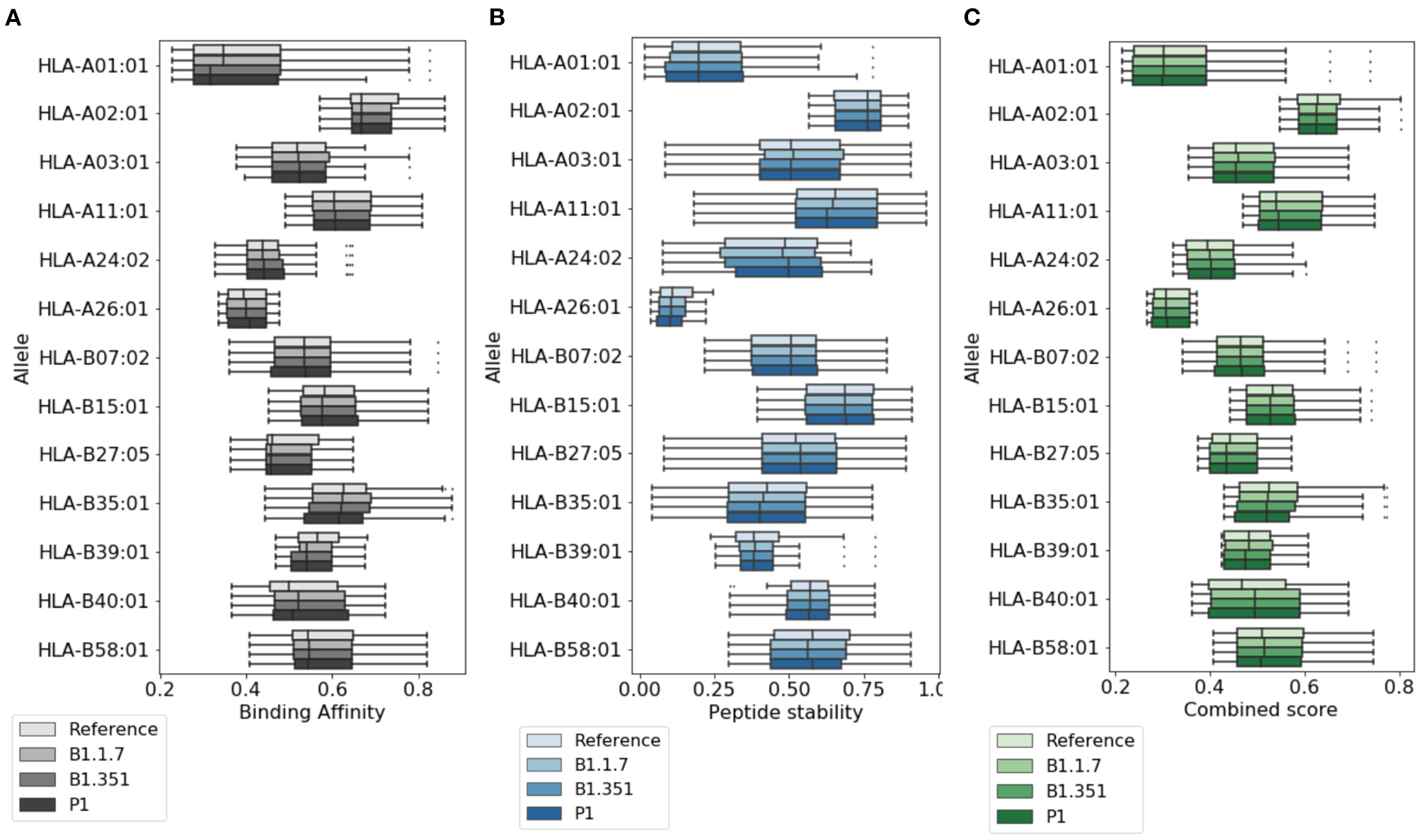 Variations of T cell epitope properties in virus variants. For the highly ranked peptides selected by NetTepi we report the boxplots for (A) binding affinity, (B) peptide stability, and (C) the combined score also including T cell propensity. Data are reported for different virus variants and alleles.