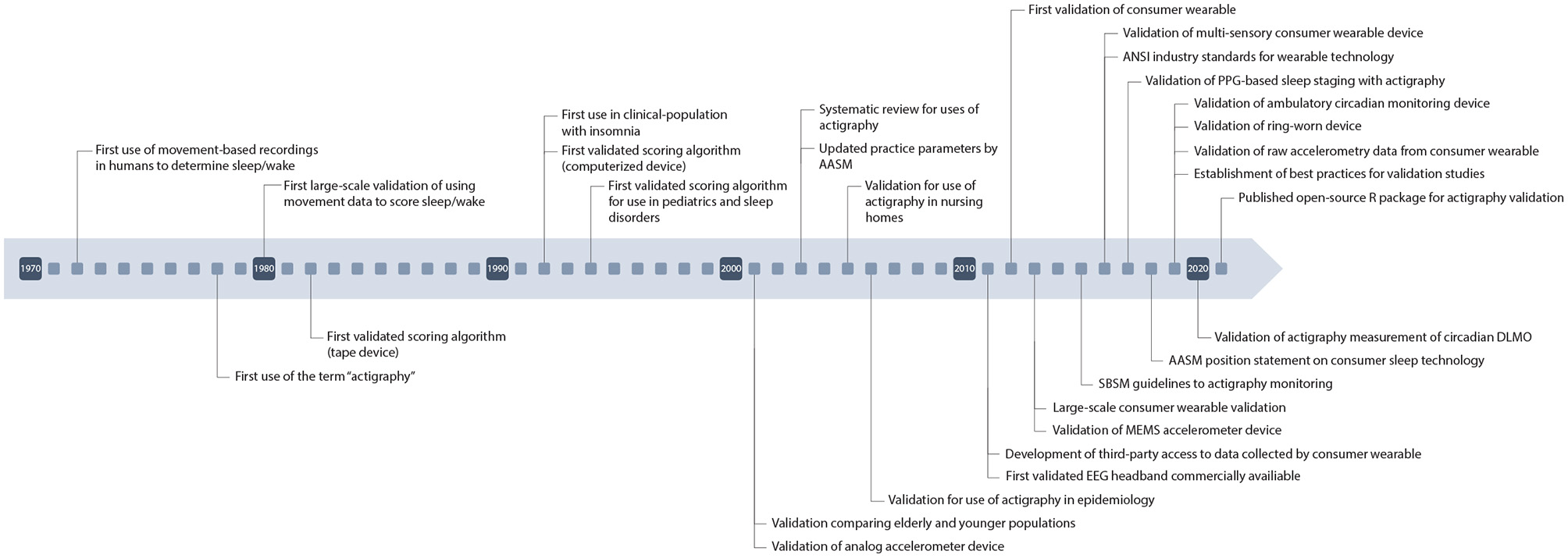 To combat these problems, researchers instead utilize movement-based devices known as “actigraphs” which measure changes in motion of an individual to predict sleep vs. wake (9). Actigraphy is an affordable alternative to PSG that can be used in free-living conditions to objectively measure sleep longitudinally as well as imposing less of a burden on subjects themselves. Actigraphy devices measure global data, including movement, to estimate sleep timing. These devices typically employ accelerometers which sample multiple axes at high frequencies to detect movement. Newer, commercial devices also house accelerometers but also include additional channels allowing them to be classified as multi-sensory and become more accurate in their scoring abilities (10). These newer wearable devices have also been able to predict sleep stages thereby giving additional scoping to their utilization for research purposes. These devices can be used to measure common sleep variables such as total sleep time, sleep efficiency, and wake after sleep onset. Figure 1 depicts many of the historical milestones relating to actigraphy and related technologies.