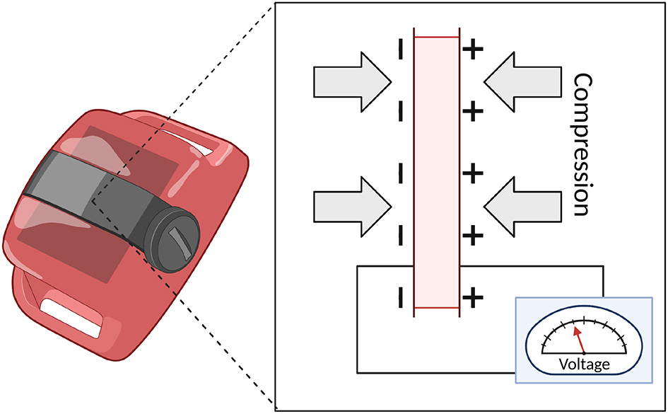 The next iteration of the technology was represented by accelerometry. Early devices employed a multi-directional analog sensor and tape recorder to collect data (22). These types of devices utilize piezoelectric accelerometers that convert changes in pressure due to acceleration (i.e., movement) into changes in voltage. See Figure 2. Essentially, these devices contain piezoelectric materials, such as crystals or ceramics, that respond to the force displacement (or compression) of a mass and convert the physical energy into electrical energy.
