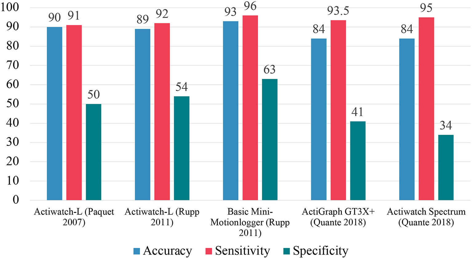 Summary of EBE analysis of standard actigraphic devices. Accuracy measures the overall ability of a device to correctly classify epochs as either sleep or wake, sensitivity measures ability to classify sleep epochs, and specificity measures ability to correctly classify wake epochs.