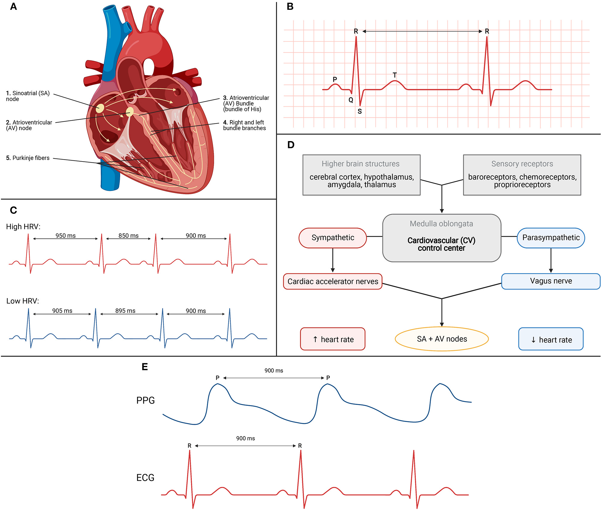 (A) Conduction system of the heart. (B) Schematic for ECG recording of electrical activity. (C) High vs. low heart rate variability (HRV). (D) Schematic depicting various factors influencing HR and HRV. (E) Correlation between R-R interval from ECG trace to P-P interval from PPG trace.