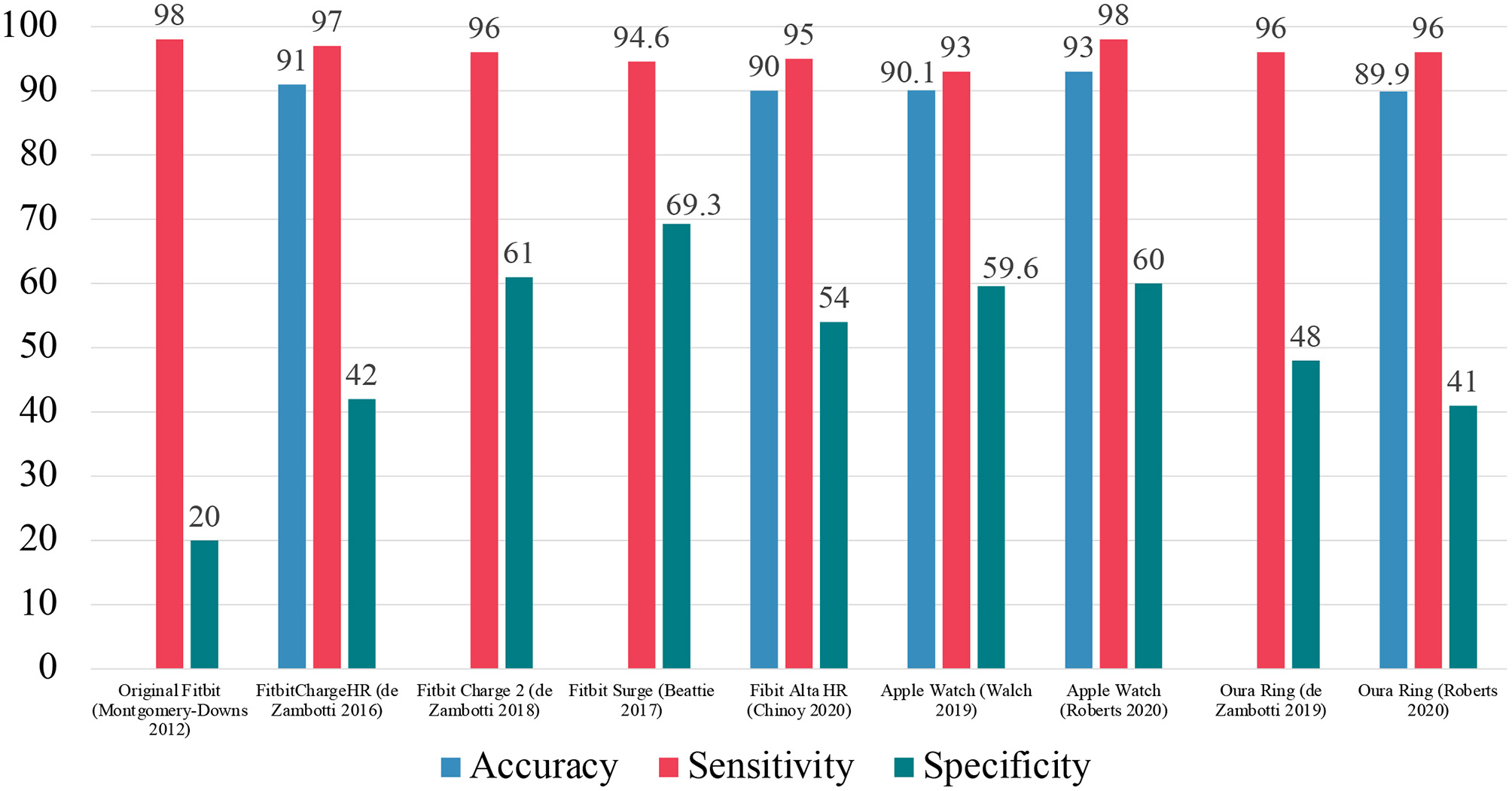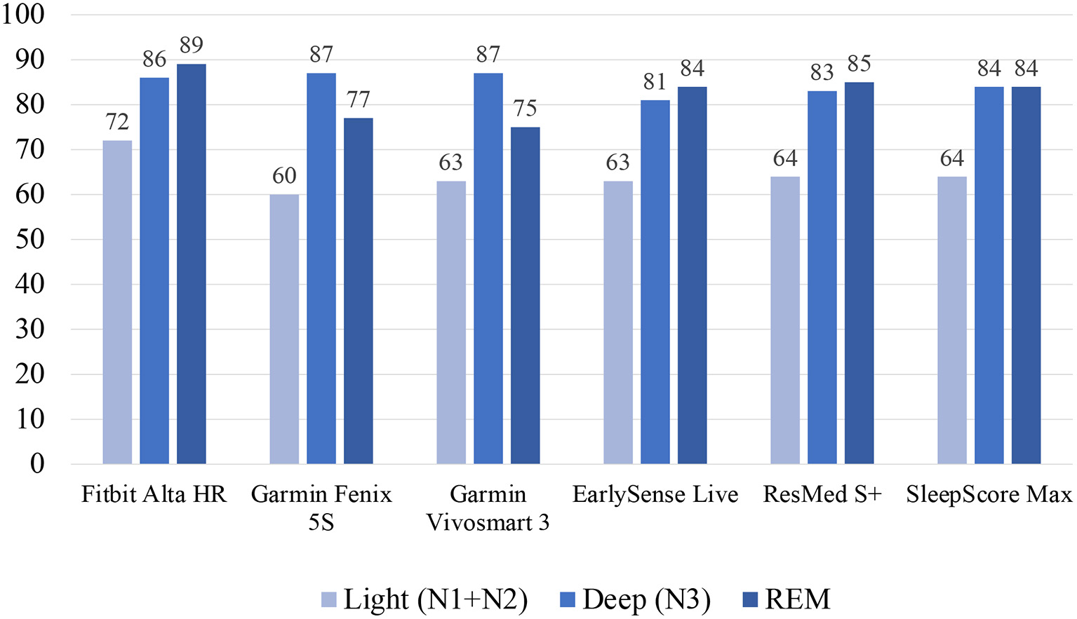 A recent study conducted by Chinoy et al. assessed the Fitbit Alta HR device (58). The device showed an overall 90% accuracy, sensitivity of 95%, and specificity of 54%. For individual sleep stages, the Fitbit Alta HR had an accuracy of 72% for classifying “light” sleep, an accuracy of 86% for classifying “deep” sleep, and an accuracy of 89% for classifying REM sleep, all relative to PSG.