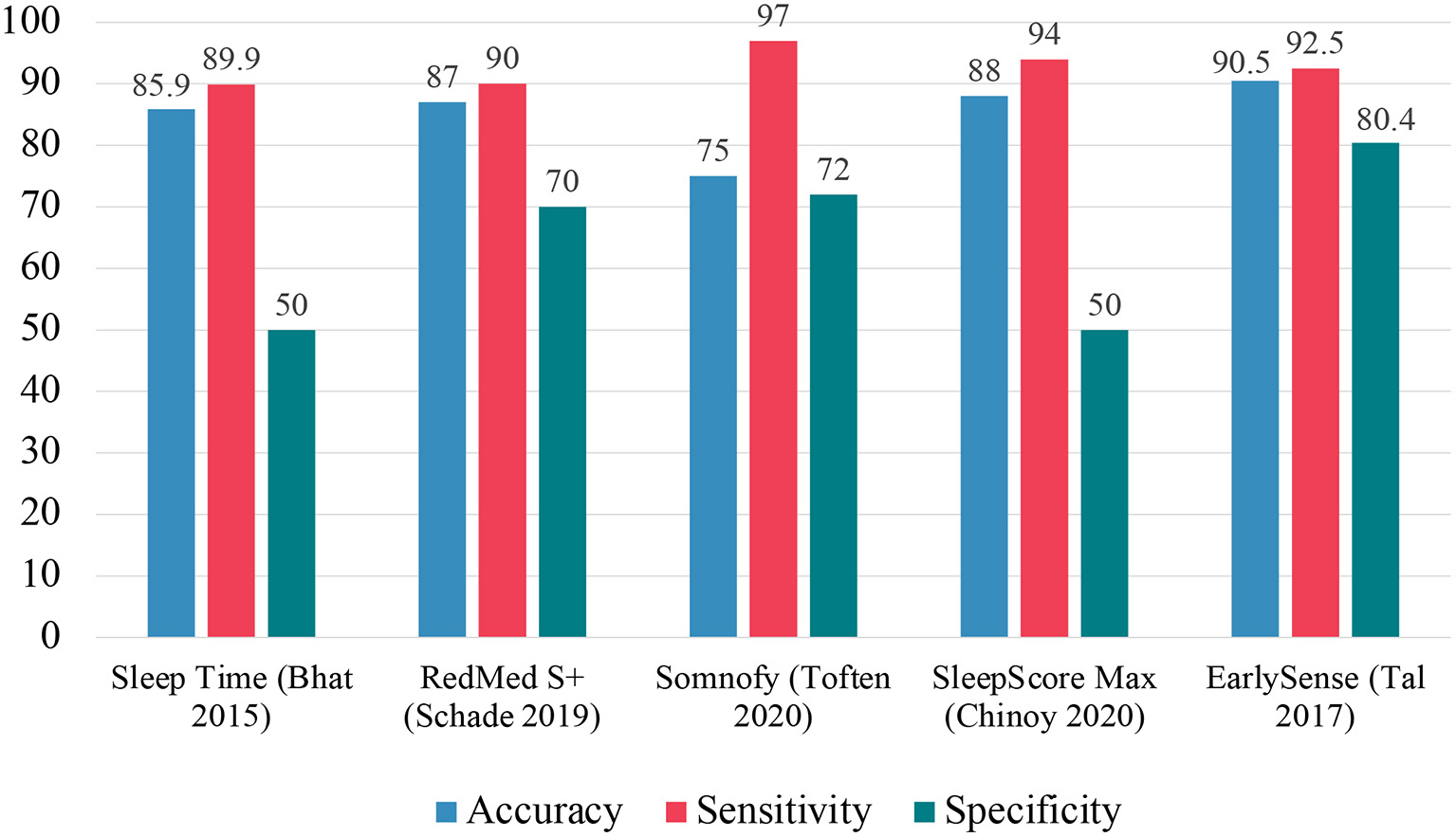 EarlySense is a non-contact sensor paired with a smartphone that collects information on HR, HRV, RR interval, RR variability, and movement to score sleep/wake (77). Tal et al. conducted a validation study of the EarlySense device compared to PSG. The device had good agreement with PSG for TST. In EBE analysis, the device showed an accuracy of 90.5%, sensitivity of 92.5%, and specificity of 80.4%. For individual sleep stages, the agreement between EarlySense and PSG was 80.4% for wake, 64.9% for light sleep (N1+N2), 56.2% for SWS, and 53.7% for REM.