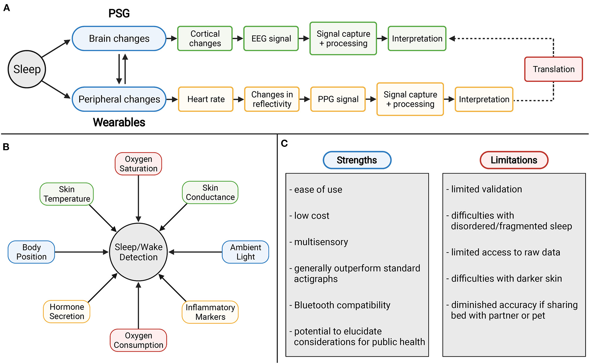 Consumer wearables, including Fitbit, Apple Watch, and Oura Ring, include more sensors (i.e., use of PPG in addition to accelerometry), which allows for a greater opportunity to achieve accurate sleep/wake scoring. With these improvements, these devices may better serve clinical populations, such as those with insomnia, based on increased specificity (wake detection). These consumer devices are also generally less expensive and more available than some of the older devices. As opposed to standard actigraphic devices, these consumer wearables can modestly predict sleep stages because of their inclusion of other sensors. Regarding weaknesses, the scoring algorithms utilized by these consumer devices are typically proprietary to the developers with little access to raw data. Second, because these devices are commonly updated with new hardware, firmware, and software updates, it is not clear the degree to which any specific iteration alters accuracy or other aspects of performance in context. For example, an update could either increase or decrease the accuracy of the device. This would be especially detrimental if such an update occurred during an ongoing study.