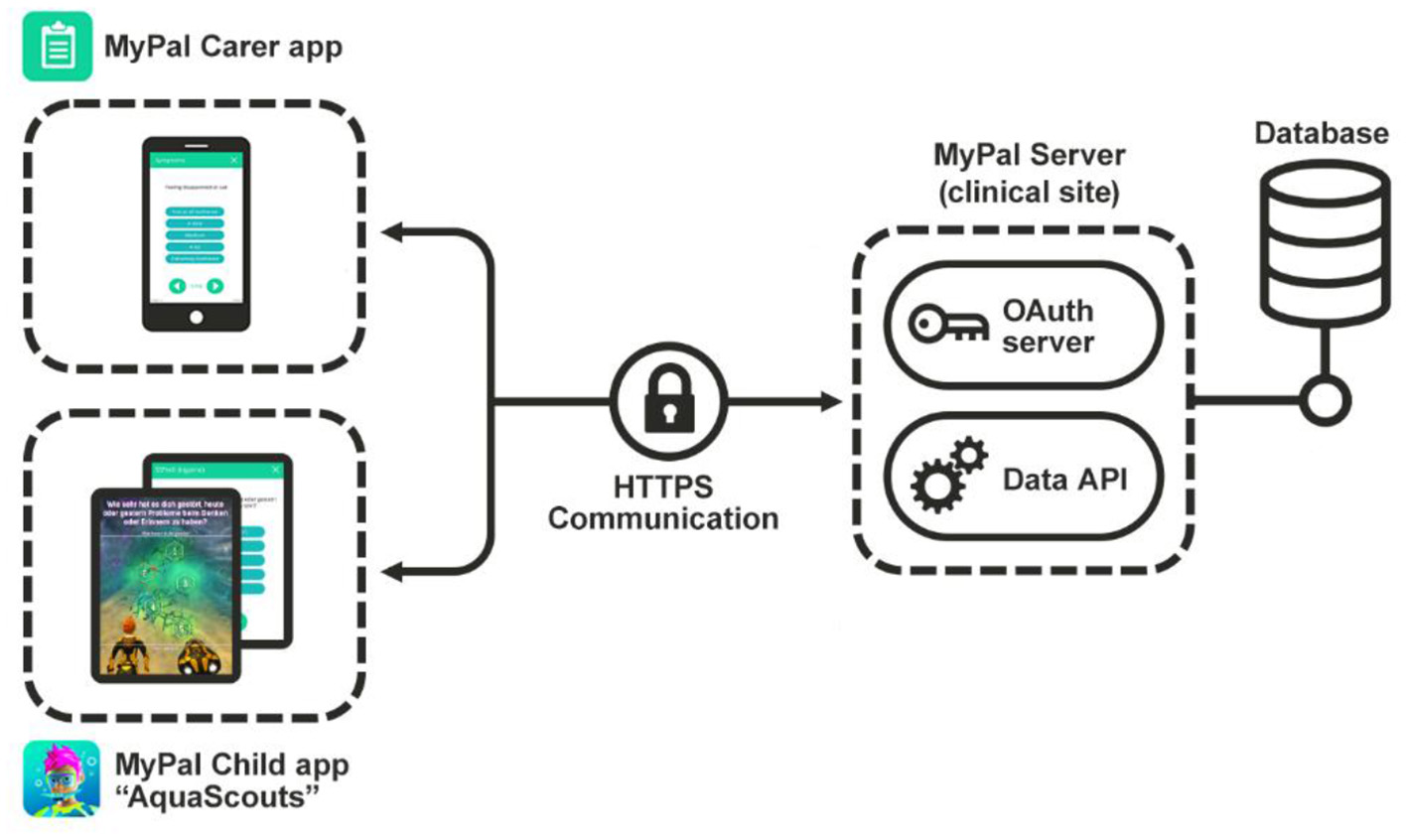 The two apps “MyPal Carer App,” “MyPal Child App”/“AquaScouts” were developed based on the “Unity” framework targeted for Android and iOS mobile devices. Besides the video game and the questionnaires, the mobile device's sensors are used to approximately estimate the number of daily steps. An overview of the MyPal-CHILD Technical Infrastructure is depicted in Figure 1. In terms of data flow, data collected in the mobile apps are sent to a REST API using SSL encryption and OAuth 2.0 authorization at a server in the clinical site that stores them to a local database.
