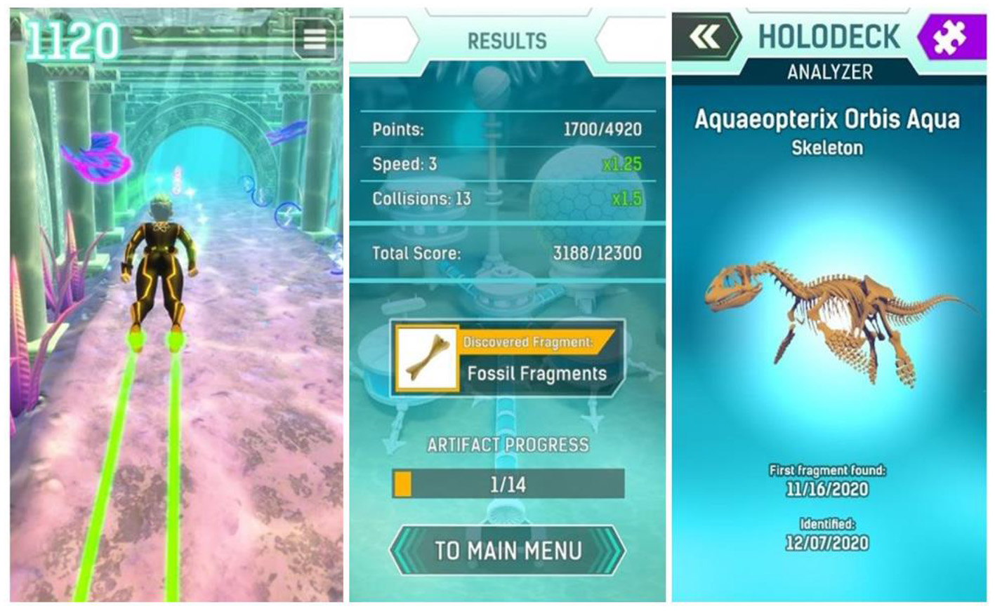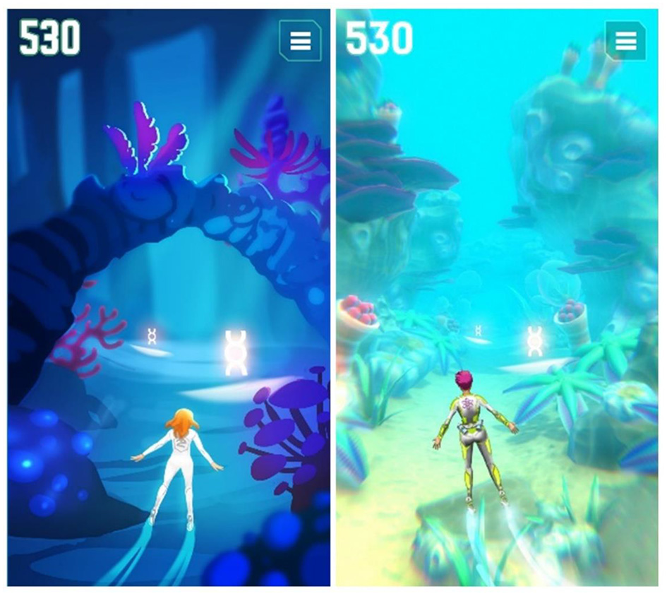 To engage players right from the beginning, a compelling theme was created setting players as “AquaScouts,” i.e., scientific adventurers, who explore an alien ocean world. The player's avatar is a diver, who searches the seabed and tunnels of the world to collect artifacts, i.e., fragments of alien machinery, cultural heritage, and fossils of indigenous dinosaurs, as well as a non-indigenous parasite threatening the ecosystem. The esthetic focus is on the underwater aspect (wildlife, ancient civilization, corals rainbow fish, etc.), not emphasizing on the Sci-Fi aspect. The graphical style is as colorful as possible to create an enjoyable atmosphere. This setting was used to create a cheerful environment, which is appealing to all ages and genders. Since the target group of the study includes both children and adolescents, a suitable visual art style had to be defined that is accepted by the whole range of the children and adolescents age group. This applies not only to colors, shapes, and characters of the game world but also to the user interface design. As a result, a detailed and colorful 3D art style (Figure 2) was developed to bring the exotic underwater world to life (Figure 3).