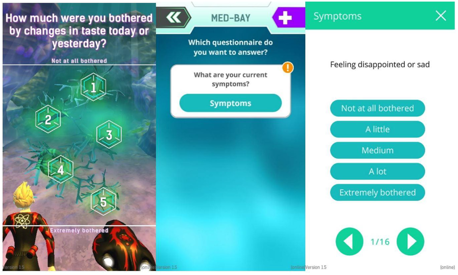 Left: In-game question, Center: Sick Bay with one questionnaire. More questionnaires can be shown here if available. Right: Exemplary symptom questionnaire.