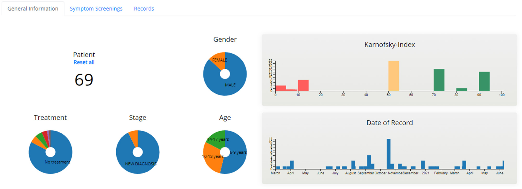 The aggregated dashboard page (Figures 7, 8) uses interactive graphs to present information for all patients allocated to the specific healthcare professional. The visualized information includes demographics, treatment, stage of treatment, Karnofsky index, day of record, and scores of the completed PRO questionnaires. The healthcare professional is able to navigate and interact with the graphs and form patient groups by selecting age, gender, treatment, scores of PROs, etc., whereas abnormal scores are highlighted to provide a warning.
