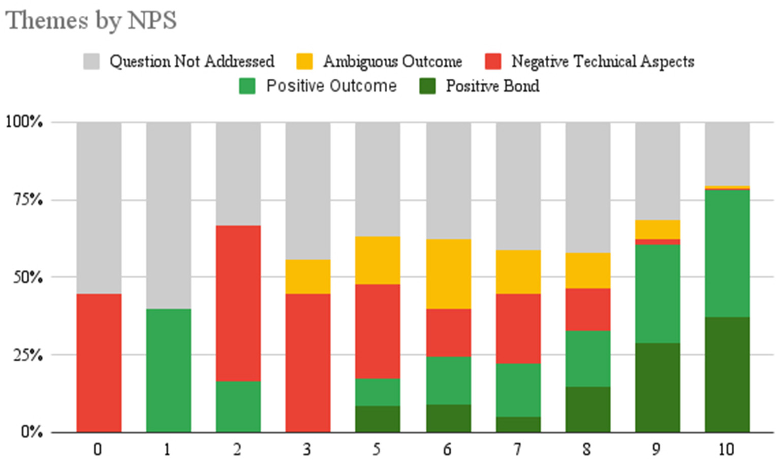 The aims of the current study are to (1) understand the distribution of net promoter scores, (2) conduct a thematic analysis on qualitative elaborations to the net promoter scores, (3) understand the distribution of net promoter scores per theme, and (4) conduct a single word analysis to understand the frequency of words present in the qualitative feedback. It is hypothesized that high net promoter scores will be found, and the topics of the thematic analysis would be around usefulness, technical problems, and anthropomorphizing the chatbot.