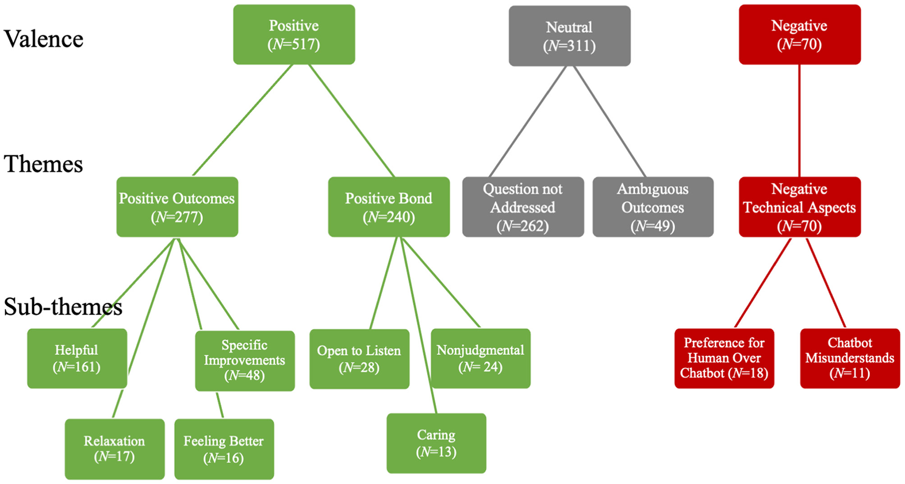 Fitzpatrick and colleagues (11) conducted a study on the chatbot Woebot for young adults. This study included qualitative analysis of user's responses to questions on what users thought was best and worst about their experiences with the chatbot. Thematic analysis revealed two themes for the best parts of the chatbot: process and content. The process theme included comments on the chatbot's accountability, empathy, other “personality” features, the chatbot's facilitation of learning, and the conversation. Negative themes identified included issues with process violations, technical problems, and dissatisfaction with the content. It is noteworthy that many users gendered the chatbot and called it a “friend” despite the purposefully robotic name assigned to the Woebot to highlight that it was non-human.