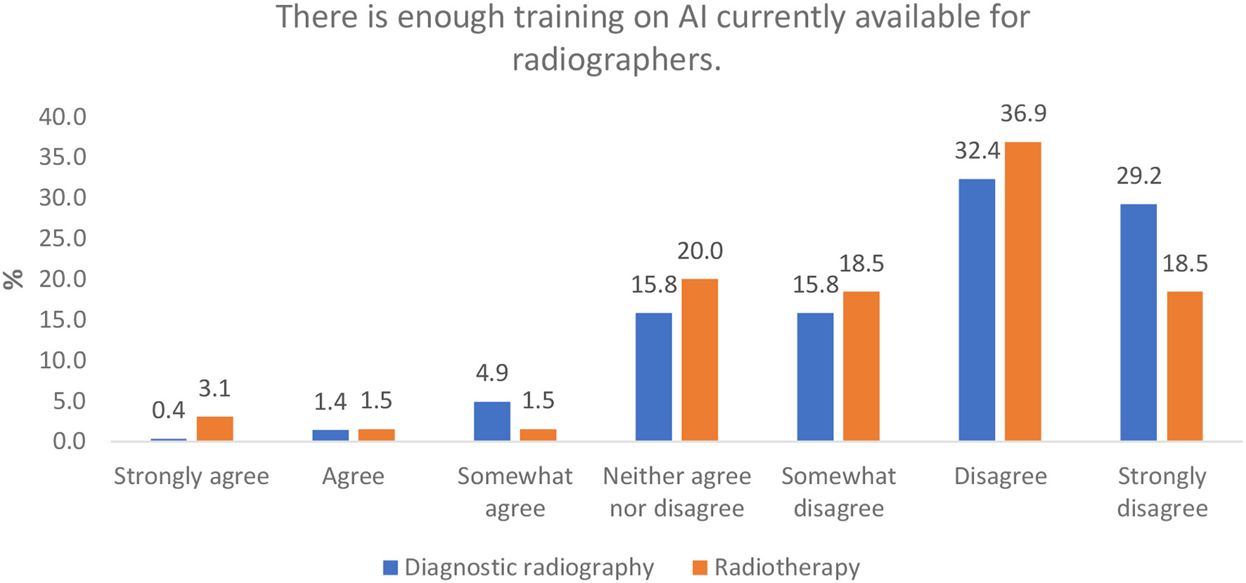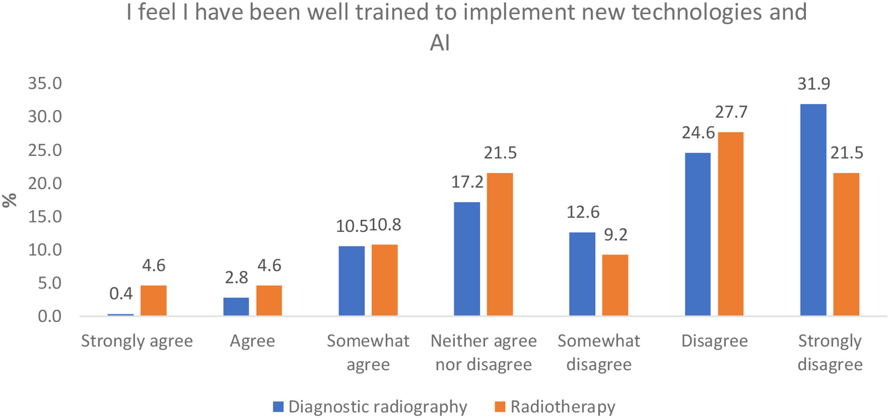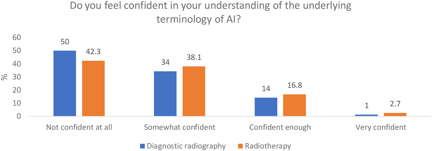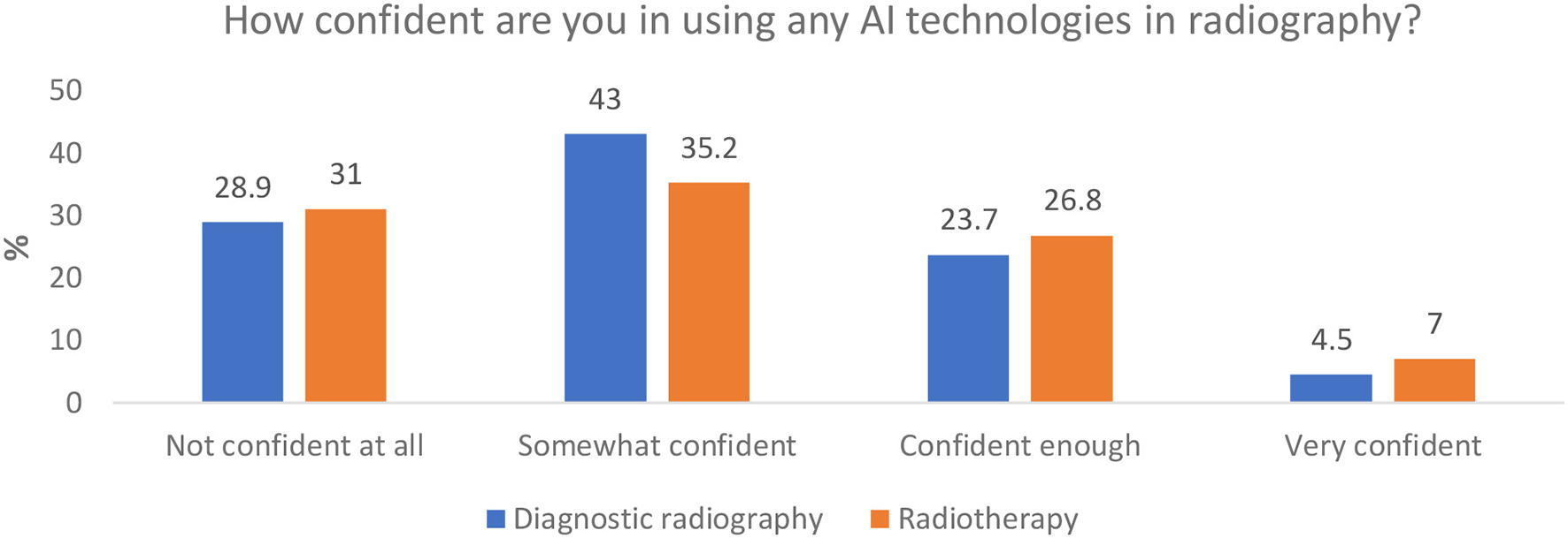 Results: Four hundred and eleven responses were collected (80% from diagnostic radiography and 20% from a radiotherapy background), broadly representative of the workforce distribution in the UK. Although many respondents stated that they understood the concept of AI in general (78.7% for diagnostic and 52.1% for therapeutic radiography respondents, respectively) there was a notable lack of sufficient knowledge of AI principles, understanding of AI terminology, skills, and confidence in the use of AI technology. Many participants, 57% of diagnostic and 49% radiotherapy respondents, do not feel adequately trained to implement AI in the clinical setting. Furthermore 52% and 64%, respectively, said they have not developed any skill in AI whilst 62% and 55%, respectively, stated that there is not enough AI training for radiographers. The majority of the respondents indicate that there is an urgent need for further education (77.4% of diagnostic and 73.9% of therapeutic radiographers feeling they have not had adequate training in AI), with many respondents stating that they had to educate themselves to gain some basic AI skills. Notable correlations between confidence in working with AI and gender, age, and highest qualification were reported.