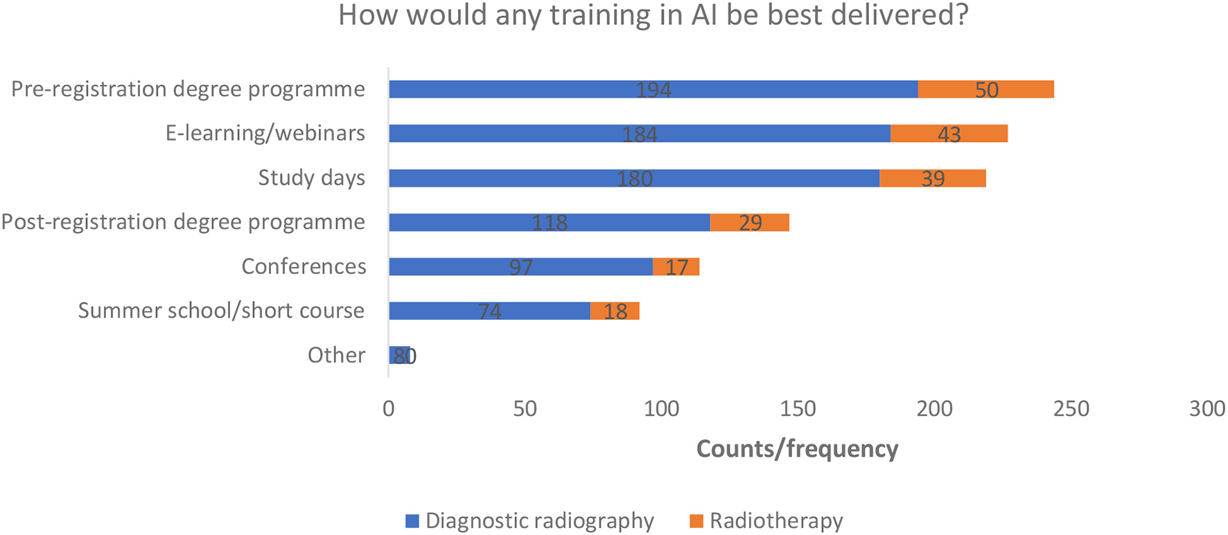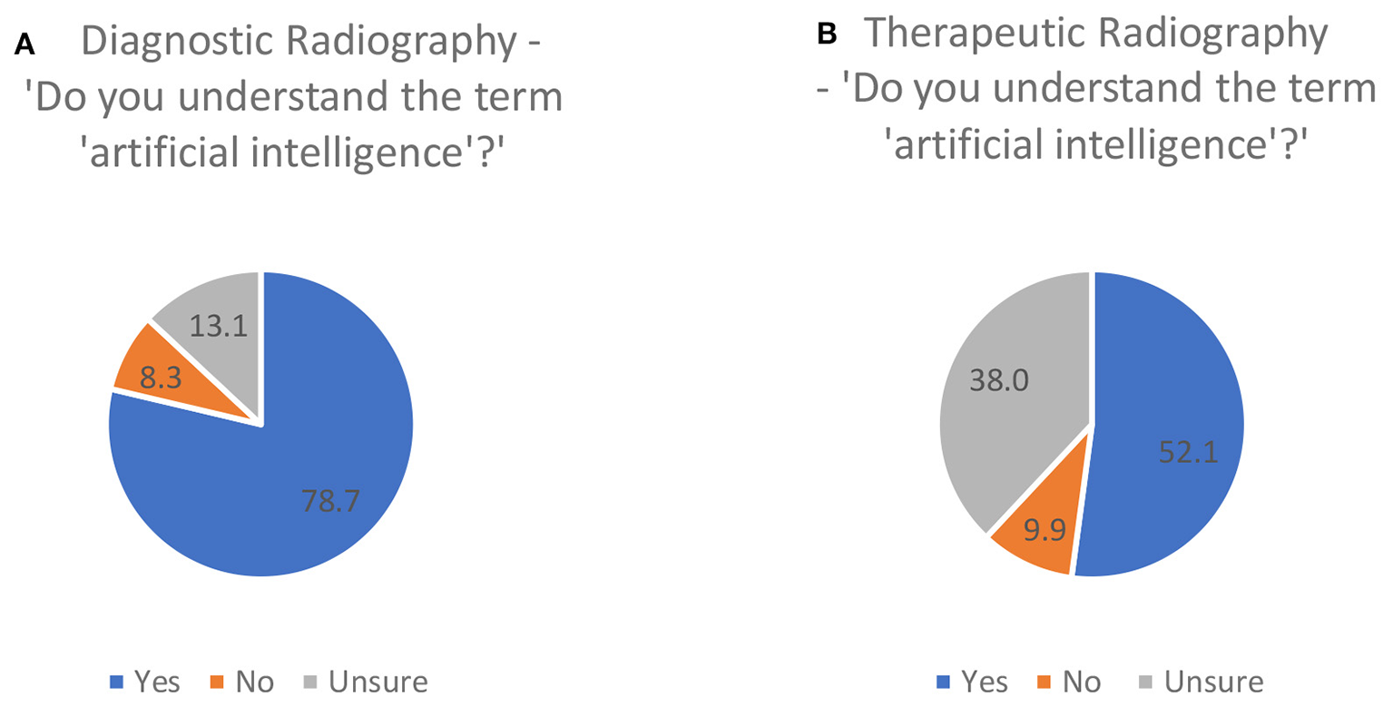 This survey was intended to give a national (UK) perspective on perception of knowledge, skills, confidence, and educational needs of both the diagnostic radiography and therapeutic radiography workforce in the field of AI. All radiographers (student and trainees, practising and retired, academic, and researchers) across all sub-specialisation areas, including sonographers, were invited to participate. The survey was disseminated via LinkedIn® and Twitter® employing non-probability snowball, sampling (51), and widely shared by the authors through their radiography-specific professional networks, many of whom are members of the SCoR AI Working Party or hold different AI leadership positions within decision making agencies. Academic colleagues were also approached to distribute within radiography academic communities and students.