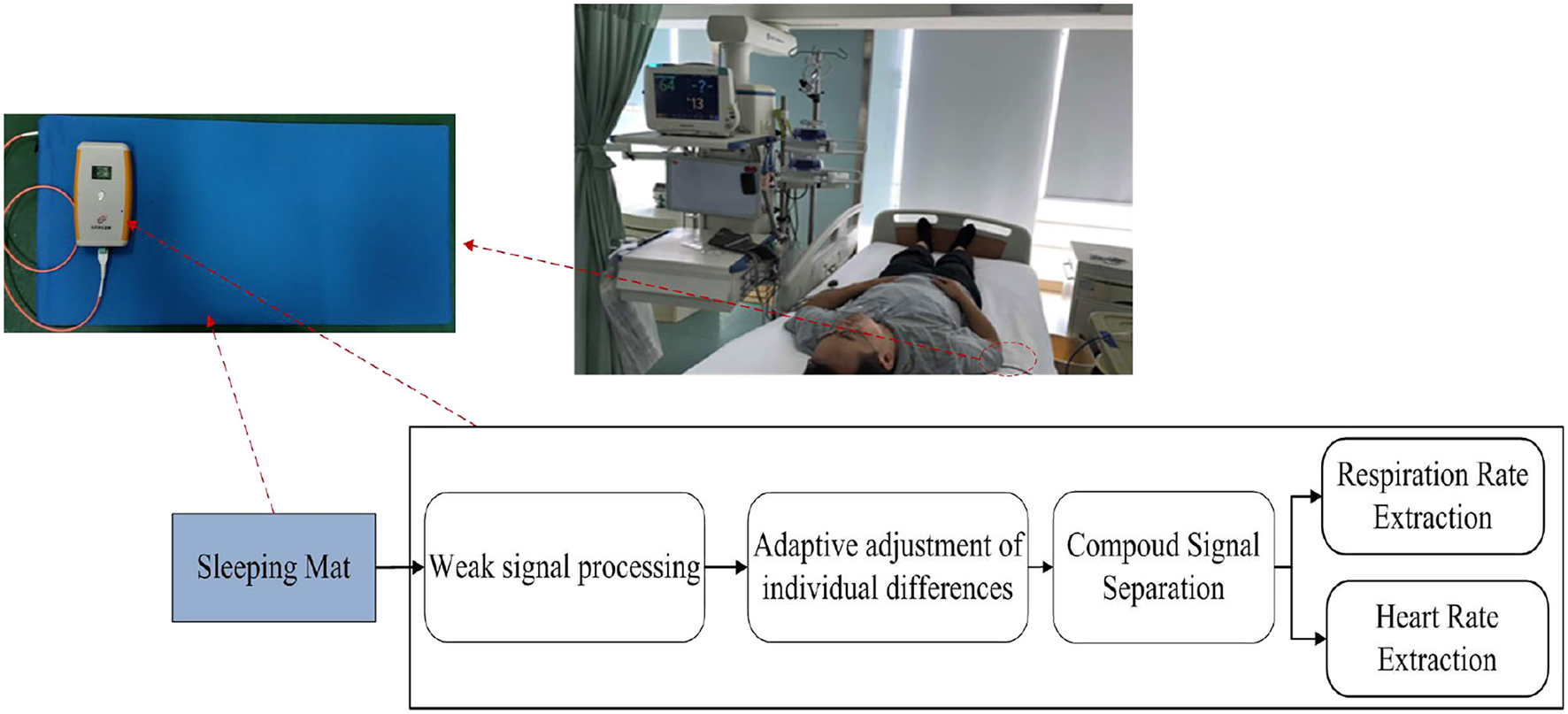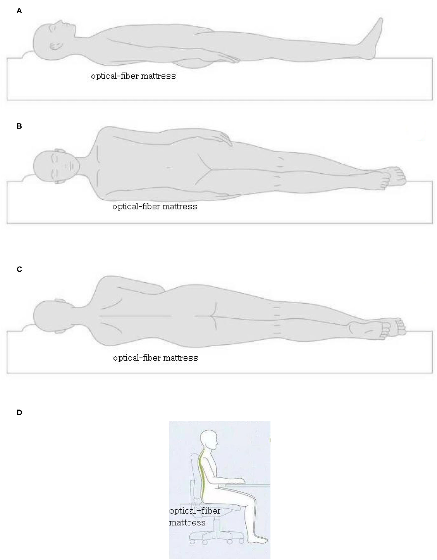 Traditional approaches of monitoring heart and respiration rates include (1) using an electrocardiogram (ECG) (4, 5) to record electrical activities of the heart over a period of time by the close connection between the electrodes and the skin of subjects, (2) using photoplethysmography (PPG) (6–8) to reflect the cardiac-induced changes in tissue blood volumes according to the measured results of probes which are clamped to fingers, and (3) using polysomnography (PSG) (9) to comprehensively record biophysiological changes of subjects while sleeping. However, these methods are not suitable for long-term monitoring due to their inconvenience and the discomfort they bring to the subjects. Recently, as an alternative approach of collecting physiological parameters without close contact with subjects, the ballistocardiogram (BCG) has been widely researched (10–13). More specifically, BCG can be used to measuring the vibrations from the head to the soles of the subjects due to blood pumping. The current studies of extracting BCG signals have been focused on the developments of the approaches and the platforms which include electromagnetic wave scanning reflectors (14), piezoelectric films (EMFI) (15), seismic detectors (16), optical fibers (17, 18), and so on. Among these approaches and platforms, electromagnetic wave scanning reflection is difficult to implement because it can be easily influenced by external environmental variations and it requires complicated hardware. Piezoelectric films also have their obvious disadvantages such as poor sensitivities and high production costs. Furthermore, piezoelectric films require multi-level amplifications which increase system complexity and production costs drastically. Seismometers are relatively expensive and insensitive to respiration. Fortunately, as a non-inductive equipment, optical fibers can could be used to obtain physiological parameters with high reliability, durability, and low cost, especially in harsh environments. In this paper, thus, an optical fiber-based mattress system was developed and could be used not only for professional medical environments but also within households.