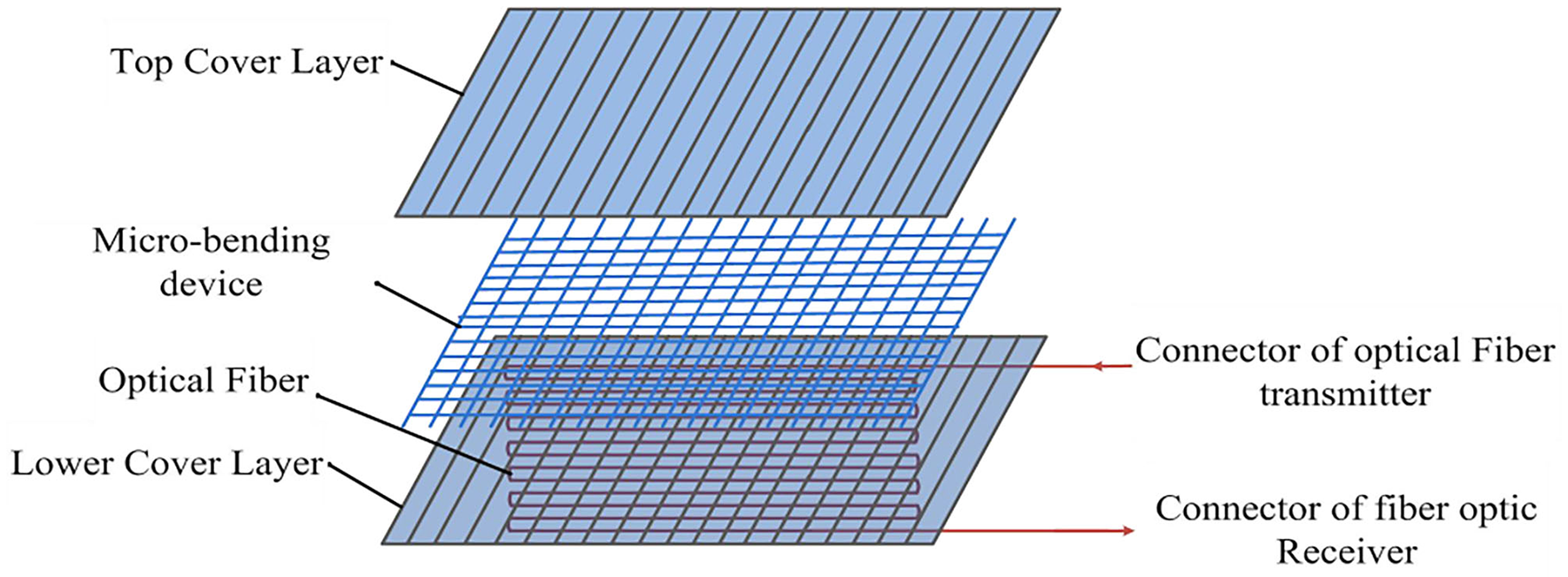 The structure of the optical fiber mattress is shown in Figure 3. It mainly consisted of a sensitive section and a collection of transmit and receive connectors. The sensitive section included gradient multimode fiber (MMF), a micro-bending device, and the upper and lower covering plastic materials (22, 23). Where the MMF was located in the center of the entire structure, close to the micro-bender, the upper and lower two layers of soft covering material were used to clamp the MMF and micro-bender in the middle, forming a sandwich structure. The soft material, which covered above and below the sandwich structure, could protect the fiber well and improve the reliability and stability of the mattress. At the same time, in order to ensure the high sensitivity of the fiber mattress, it was required that the fiber optics were evenly distributed. In order to meet the above requirements, the design used a serpentine back-fold ingress sloth to distribute the fiber optic sensor evenly in the middle of the mattress, while using MMF to improve optocoupled efficiency and enhance detection sensitivity.
