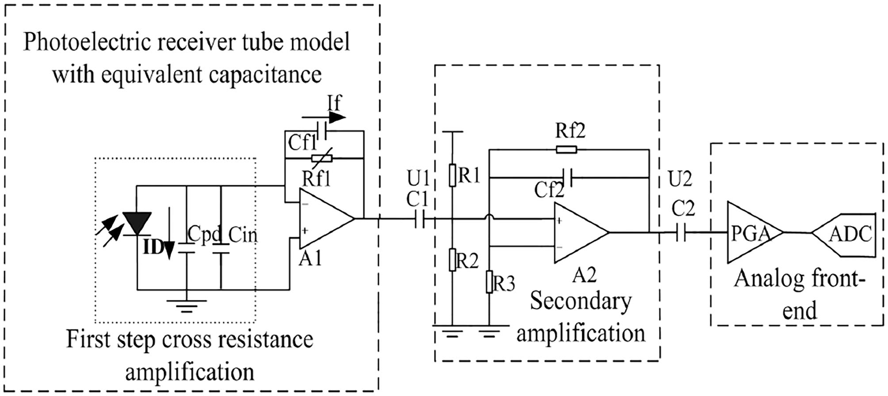 The key issue of obtaining the electrical signals from the optical fiber mattress was that the signals had small amplitudes. This paper used the following methods to solve this issue. Firstly, the weak current signal was translated into a voltage signal with amplification by a trans-impedance amplifier. For weak signal processing, current and voltage noises of the system must be kept at a low level. Secondly, the optical fiber transmitter and receiver were placed within a metal shield and shielding rings were included in the transmitting and receiving circuits. The wavelength of the fiber optic sensor was 900–1,650 nm, with a typical value of 1,310 nm and a saturated power of 10 mW. It was shown that the current level of the detector was at the nA level, and the signal amplitude after the first-step cross-resistance amplification was approximately 40 mV. In practice, the feedback resistor brought more noise into the circuit as well, although increasing the feedback resistor improved the magnification ratio. As a result, the front two levels of the amplification circuits mainly consisted of the OPA656 (TI) amplifier, and the third-level amplification adopted an analog front-end as a 16-bit high-precision sigma delta AD of an ADS1115 (TI) sampling circuit to realize weak signal processing (see Figure 4).
