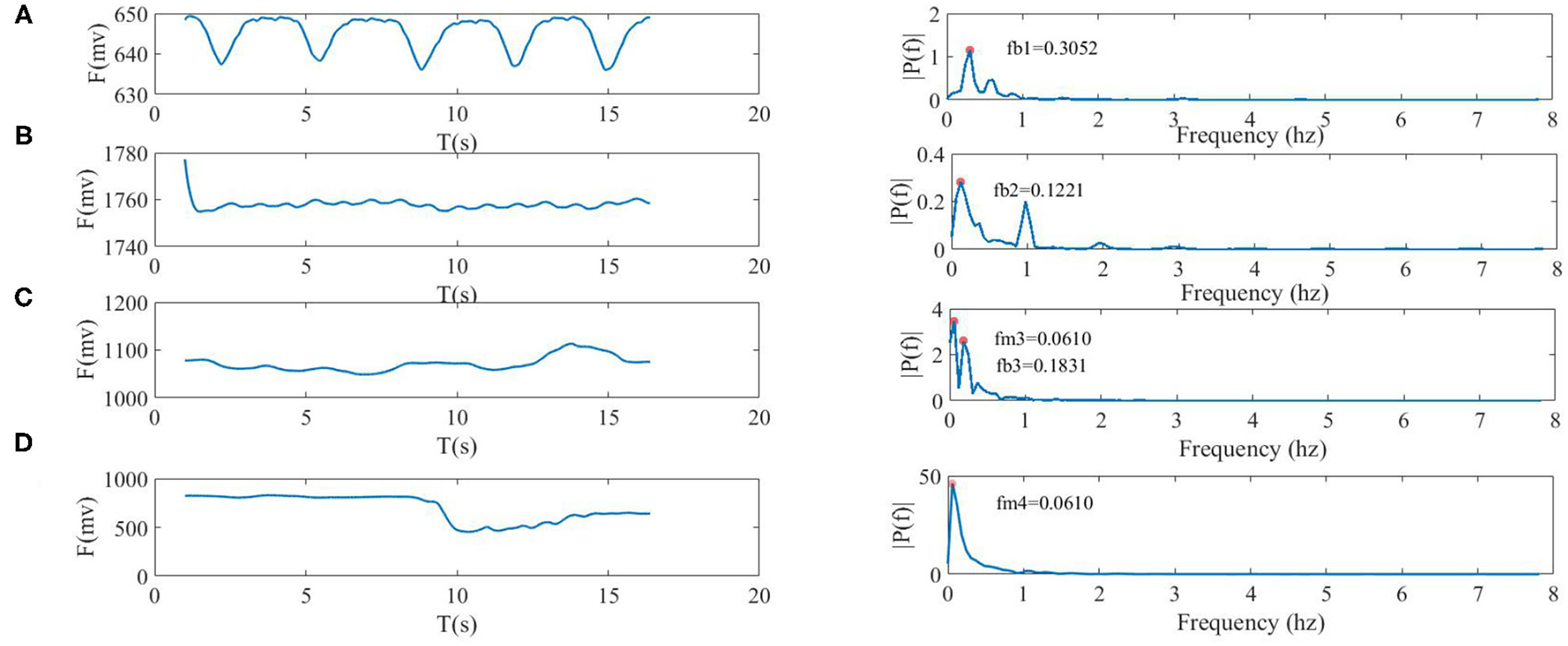 Four types of breath waveforms (the left side) and spectra (right side), where fb1, fb2, and fb3 were frequencies of respiration, and fm3 and fm4 were frequencies of movement. (A) static state, fb10 = 0.3052 Hz, (B) the held breath state, fb20 = 0.1221 Hz, (C) slow breath was accompanied by body movement which included fb30 = 0.1831 Hz and fm3 = 0.0610 Hz, and (D) the movement state only included fm40 = 0.0610 Hz of moved frequency.