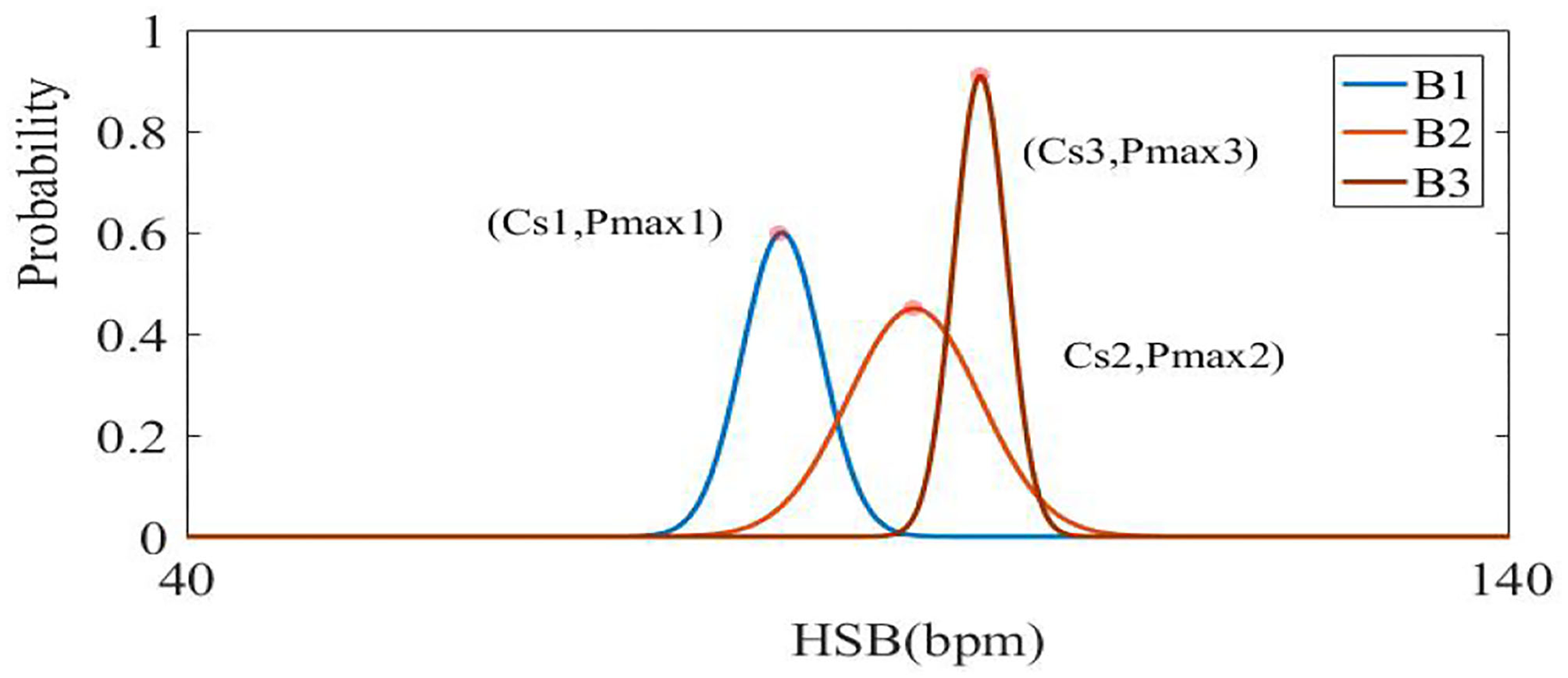 HR (heart rate in Formula 10) was calculated to fall into a sub-particle of the heart beat (HSB) at sufficient intervals, and the probability distribution under this HSB is shown in Figure 10. Specifically, HSBs were set into 44 categories between 40 bpm and 140 bpm, where the category was marked as Cj, and the median of the heart beat under each category was marked as HRj. When HR was refreshed, the probability was redistributed from B1 to B2, and B2 to B3. The category Cs with the max probability (Pmax) was found, and then the median HRs under this category were taken (shown in Formula 11).