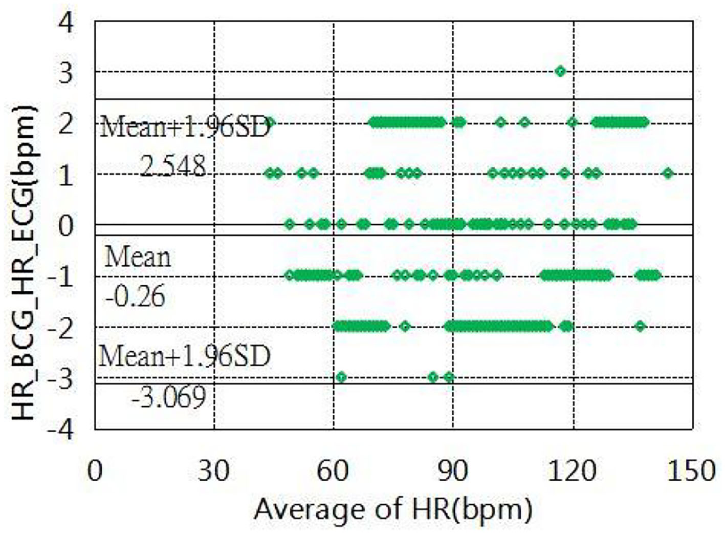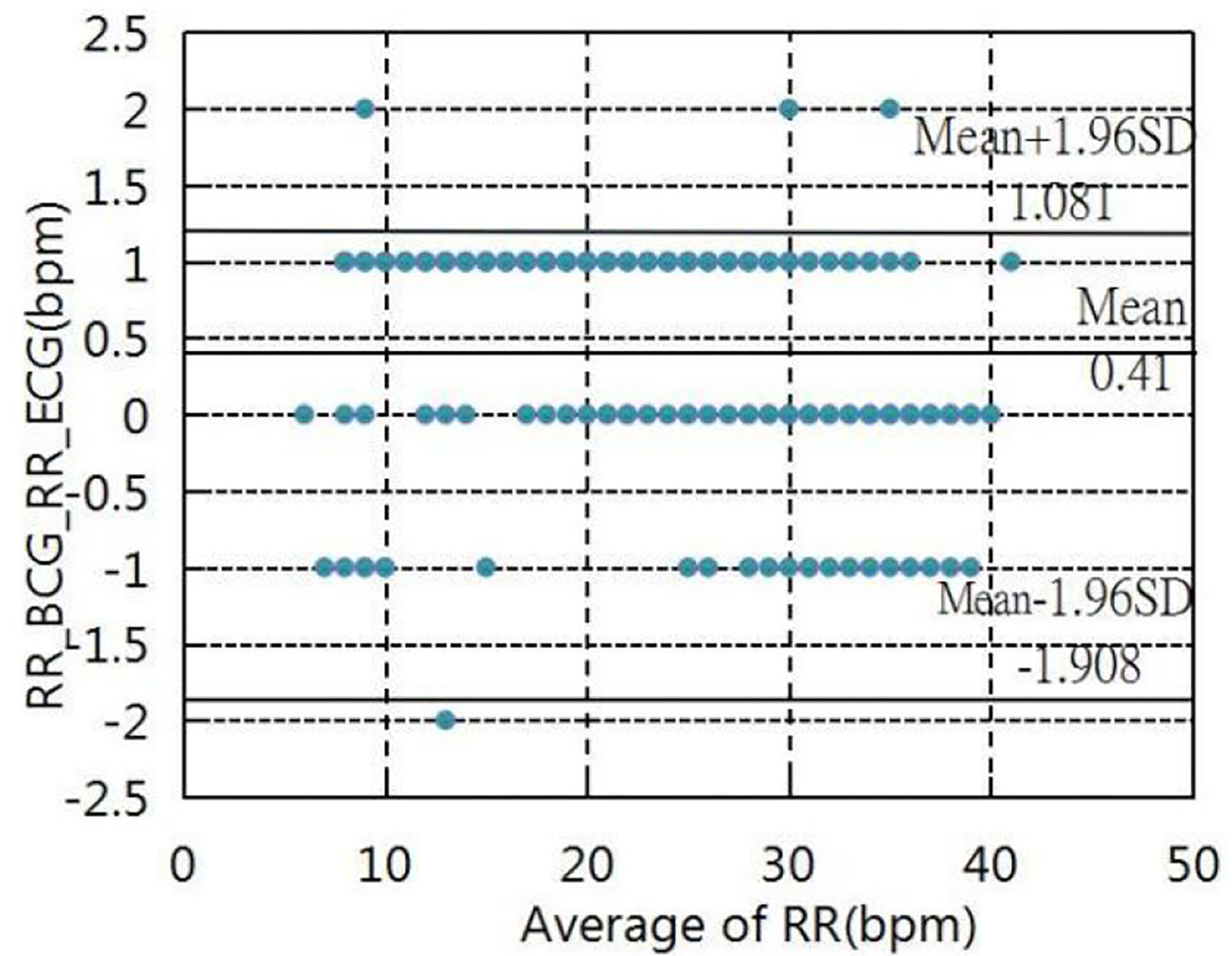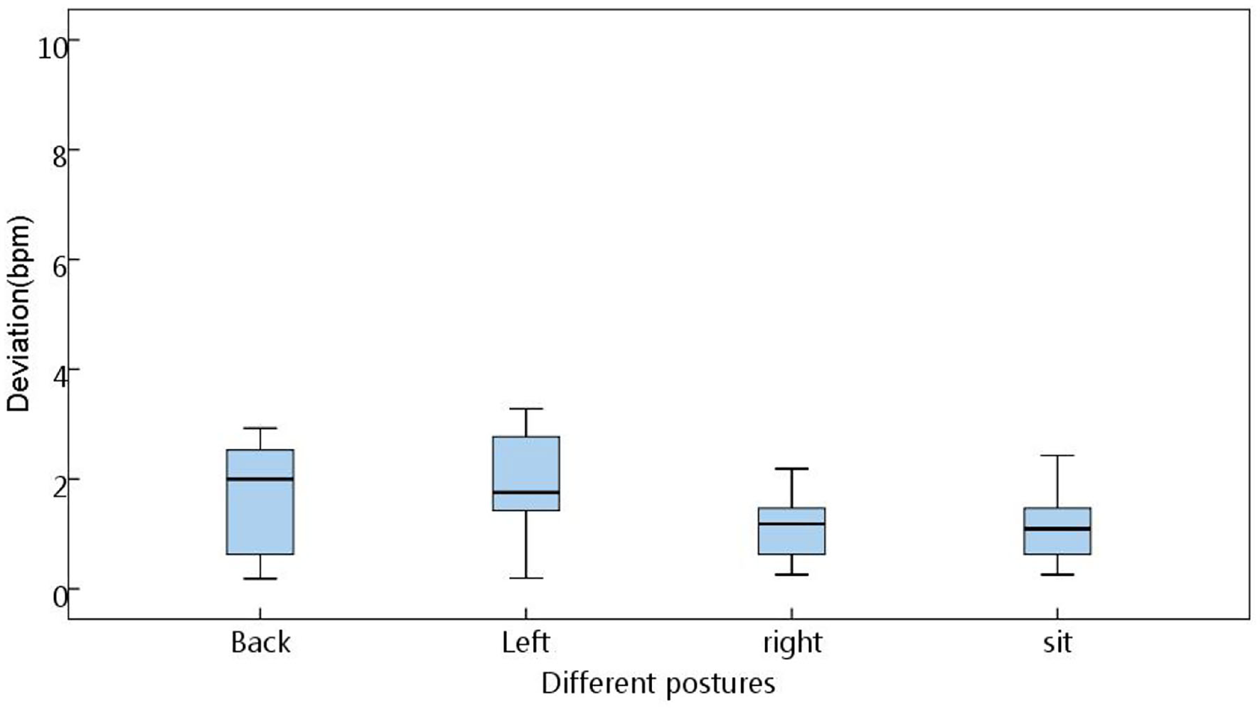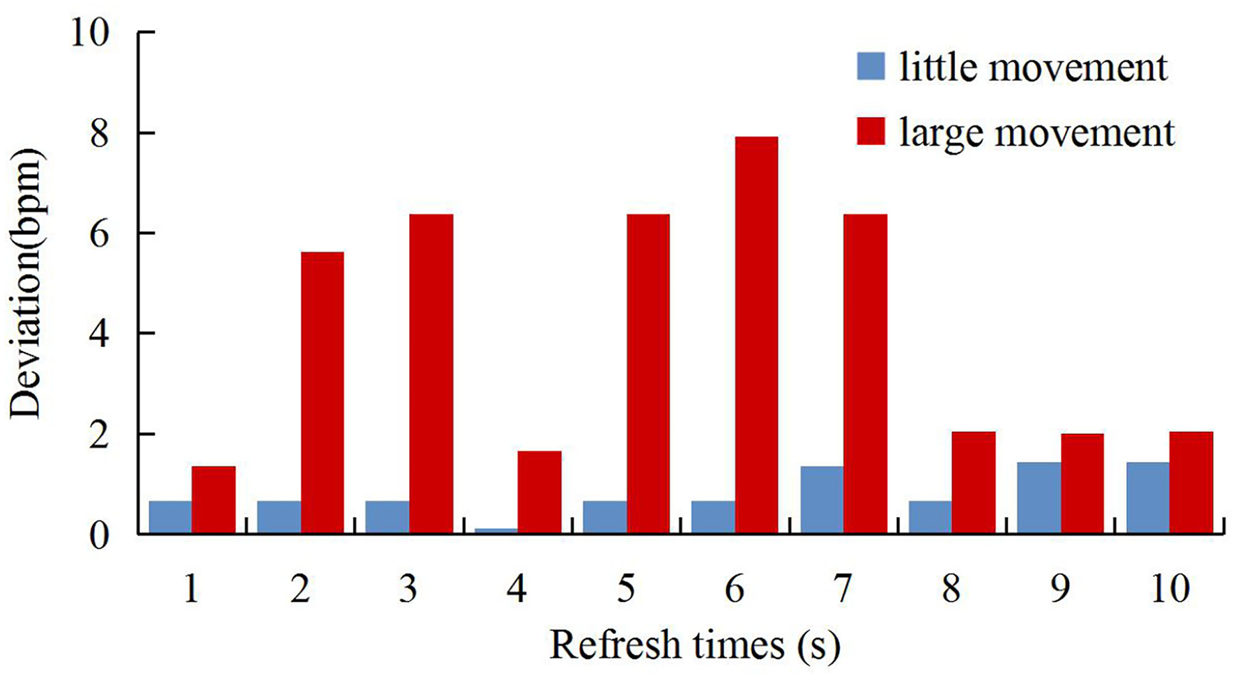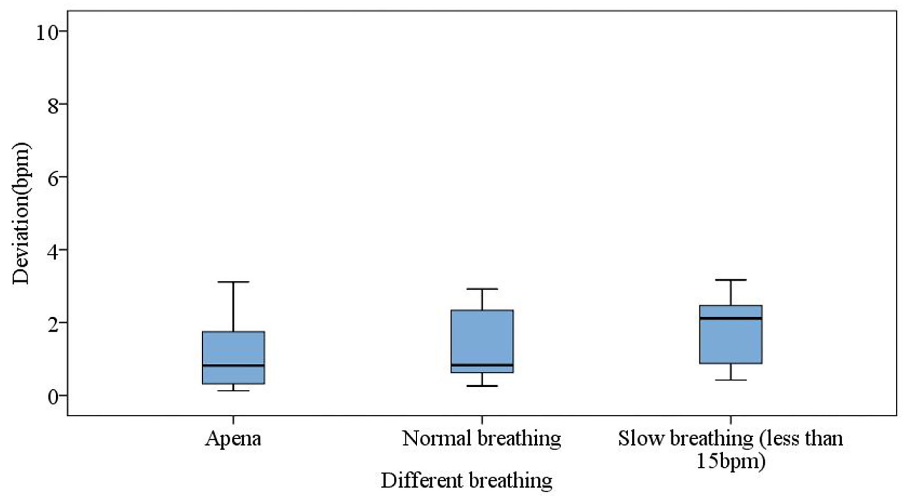 The following three kinds of states were measured. It is shown in Figure 11 that the averaged error of measuring heart rates in apnea (breath holding) was 1.09 bpm, and most of the deviations were within 2 bpm. At the same time, the mean error of normal breath was 1.44 bpm with most of the deviations within 2.5 bpm. Under the condition of slow breathing, the mean error was 1.78 bpm. As a result, the measured heart rates under normal respirations and apnea were more consistent with the standard values, while slow breathing inevitably increased thoracic amplitudes, which affected the calculation of heart rates with larger mean errors.