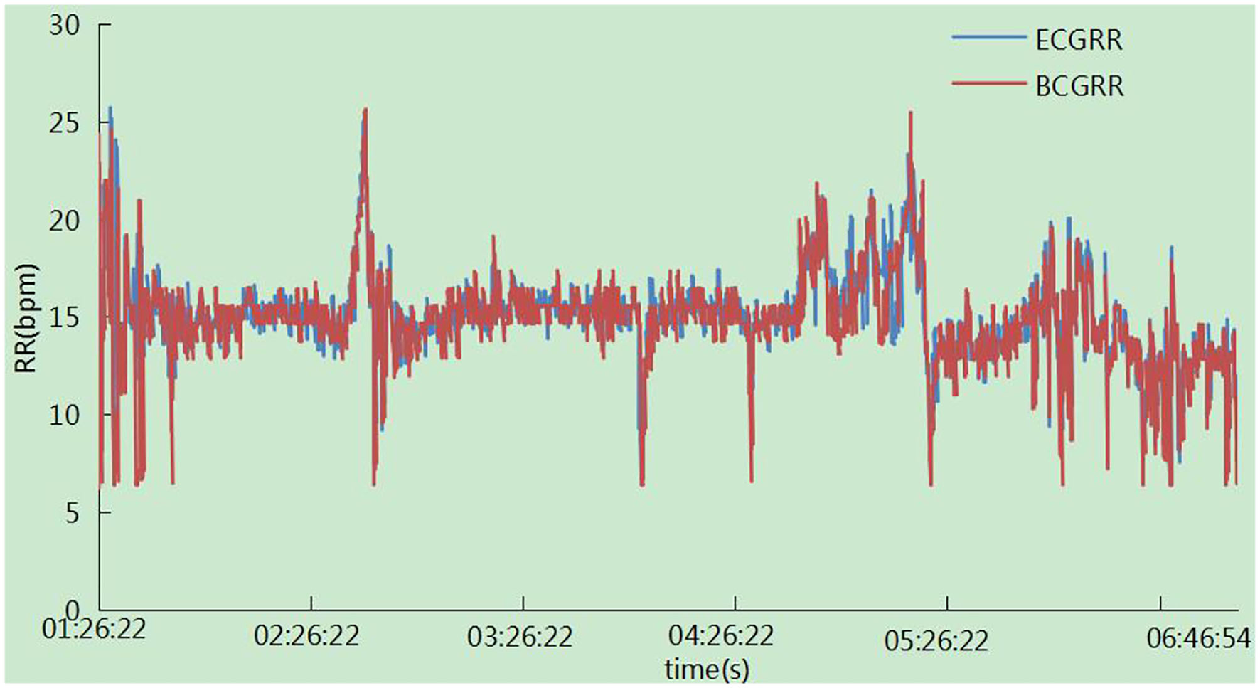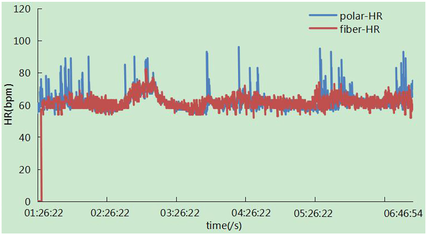 (E) In particular, there are many things that we could not predict at night, for example, wide-range changes of heart and respiration rates. In order to validate whether the system can keep up with the changes of heart and respiration rates, a 5-h nightly experiment was conducted in comparison to commercial polar beats of H10 medical equipment and electrocardiogram-derived respiratory measurements. (F) The test was applied to verify heart rates at different intensities by exercises and respiration rates using controlling breath stages. These results were compared with the Philips sure-signs VM6 Medical Monitor at the Naval General Hospital and Tiantan Hospital (Beijing, China).