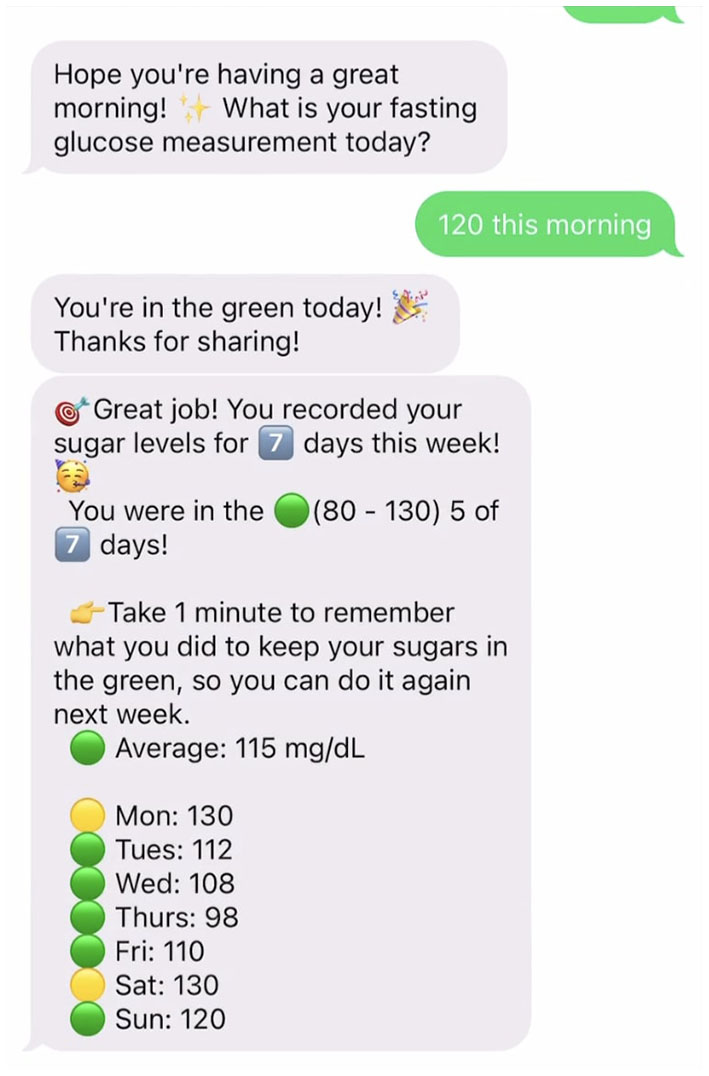 Healthy at Home uses a low-tech remote patient monitoring system to support health coaching. Remote patient monitoring may increase engagement (39) and self-management (67) in under-resourced individuals. Automated daily prompts requested fasting blood glucose. Instant feedback was automatically provided via SMS text messaging based on the range of glucose measurement with a color-coded stoplight graphic (Supplemental Figure 1D). This feedback helped participants learn how their body responded to changes in diet and exercise. Daily glucose measurements were recorded in Healthy at Home's remote patient monitoring system, which provided participants with weekly SMS-based progress reports (Figure 1). The SMS system also sent regular goal nudges to participants to help keep goals top-of-mind.
