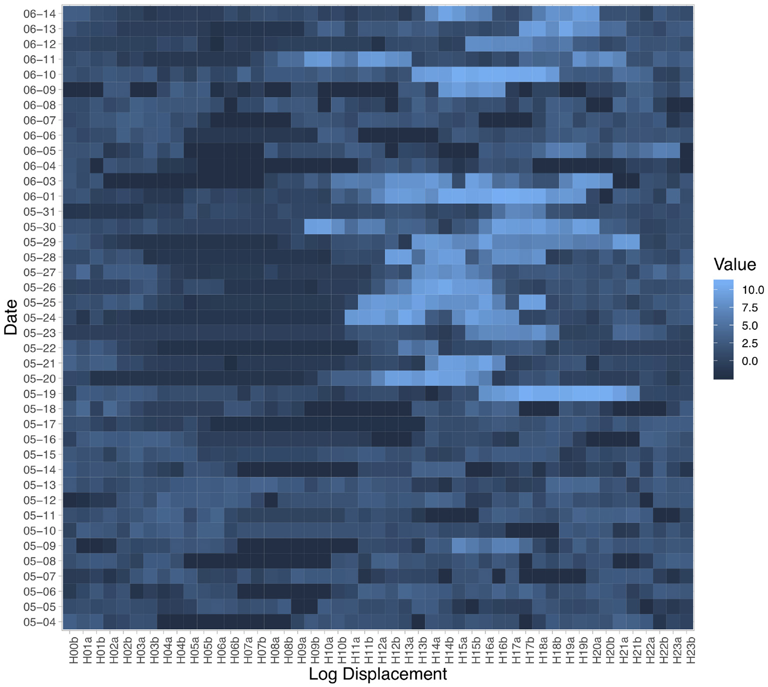 Daily Displacement Profile extracted from one participant's GPS data. Labels on the horizontal axis indicate the half-hour bins: for example, H06a indicates the 6-6:30 a.m. and H20b indicates 8:30-9 p.m. Cell color indicates the natural logarithm of the displacement detected by the smartphone GPS sensor during the current half-hour bin compared to the previous one. Brighter blue means greater displacement.
