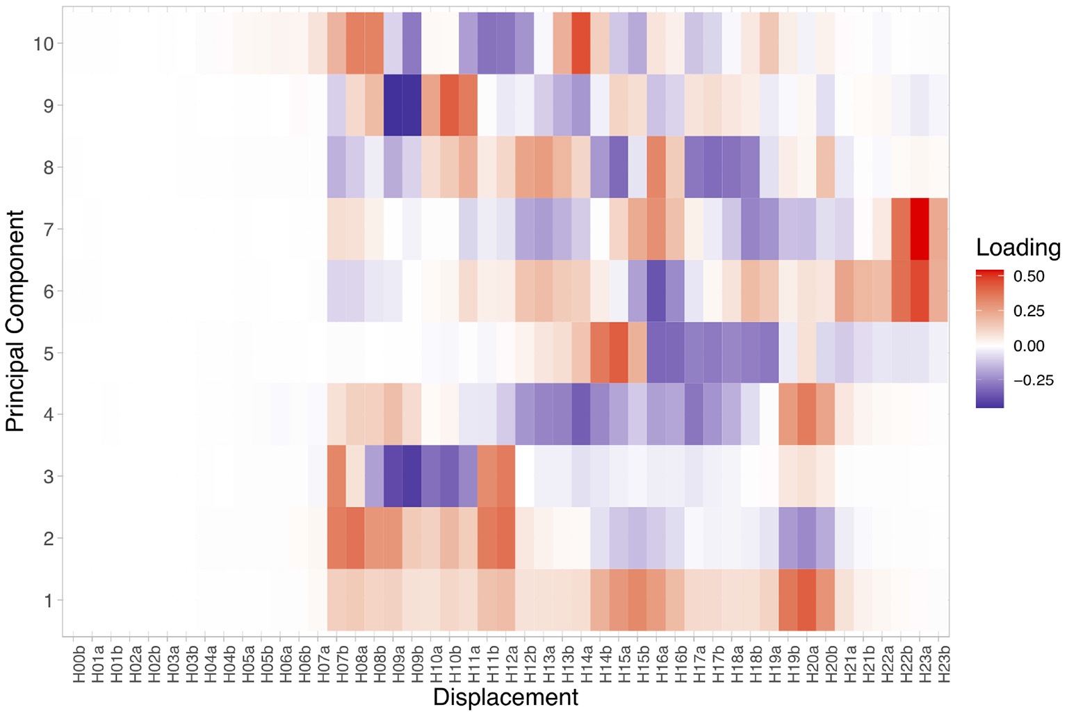 Loadings of the first 10 Principal Components of our participants' Daily Displacement Profiles. Labels on the horizontal axis are the same as Figure 1 and indicate the GPS displacement associated with each half-hour segment compared to the previous one. Cell color indicates the sign of a particular variable in relation to a PC. Red indicates that a specific PC is in the same direction as a variable whereas blue indicates that it is the opposite. Darker color (red or blue) indicates loadings with a greater absolute value.