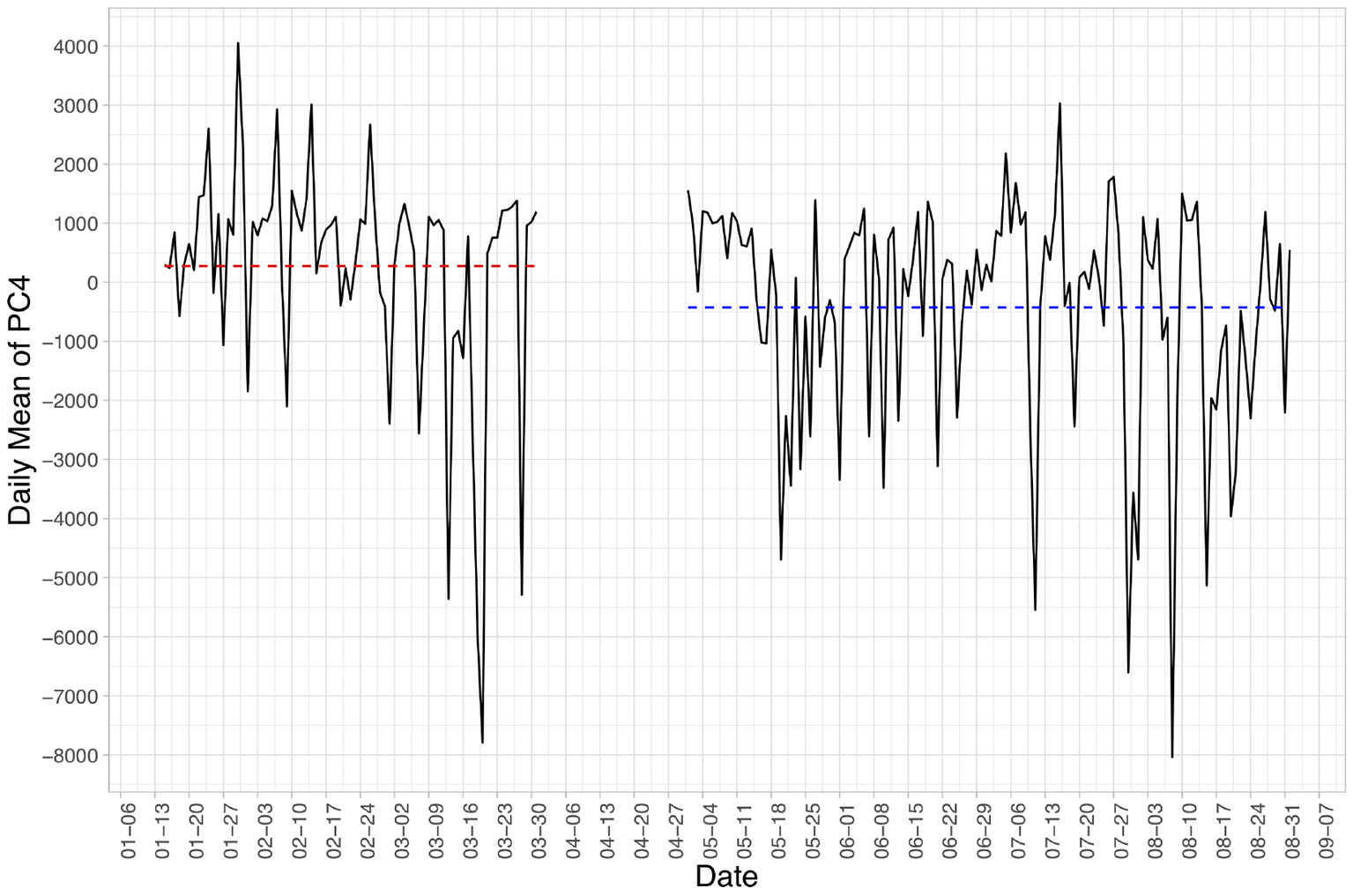 Daily mean value of Principal Component No.4 (PC4) over the two study periods. The red and blue dashed lines indicate the average value from the pre- and post-outbreak group, respectively.