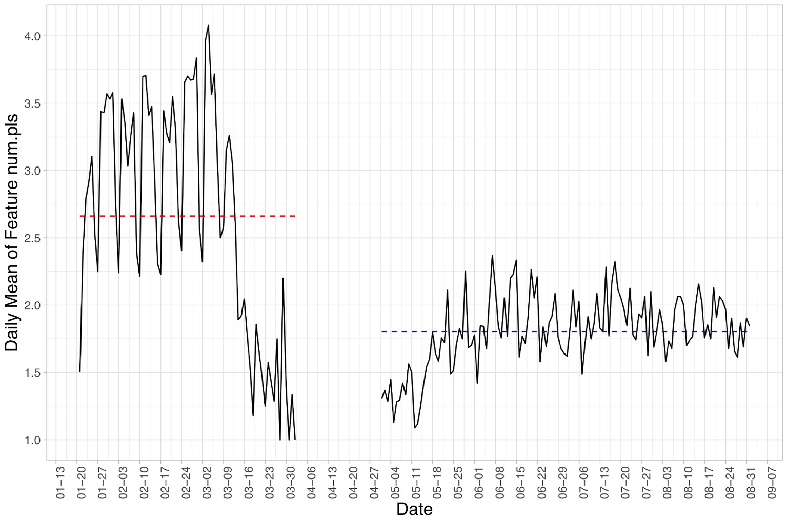 Daily mean value of the num.pls, number of significant places visited, over the two study periods. The red and blue dashed lines indicate the average value from the pre- and post-outbreak group, respectively. Note the drastic drop in March in the pre-outbreak group, coinciding with the declaration of pandemic in the US on March 13, 2020.
