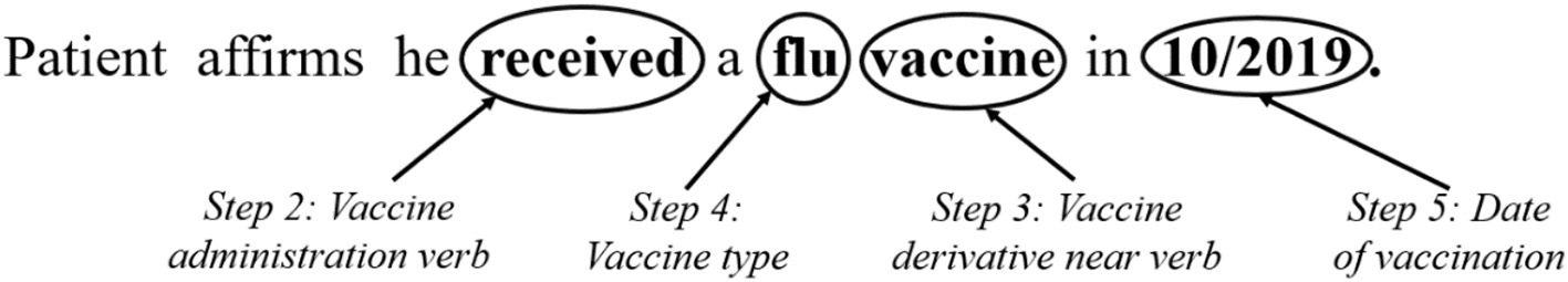 Figure 1 illustrates a hypothetical example of a vaccine administration note, with corresponding time and date, detected by the NLP algorithm created via the process described in Table 1. This figure presents the process after the notes are filtered by type (i.e., Step 1 is complete). The past tense verb of “received” was identified to indicate vaccine administration. With the identification of this verb, the algorithm then searched for a vaccine-derivative (e.g., vaccine, shot) within five tokens. The algorithm then identifies “vaccine” within five tokens of “received.” The number of tokens was selected upon manual review and assessment of the performance of various counts of tokens. The next step in the algorithm is to identify the vaccine type by searching the four tokens preceding the vaccine-derivative, which in this case is “flu.” See Table 1: Step 5 for a more detailed description of our approach to matching vaccine types and dealing with the lack of a standardized name for a reported vaccine administration. Finally, the algorithm searches for an administration date, either absolute or relative. The example presented in the figure is an absolute date of 10/2019. We tested existing date-expression mappers for this purpose but found that they did not perform well on some of the notes so created our own Regex formula to detect dates in the patient records.