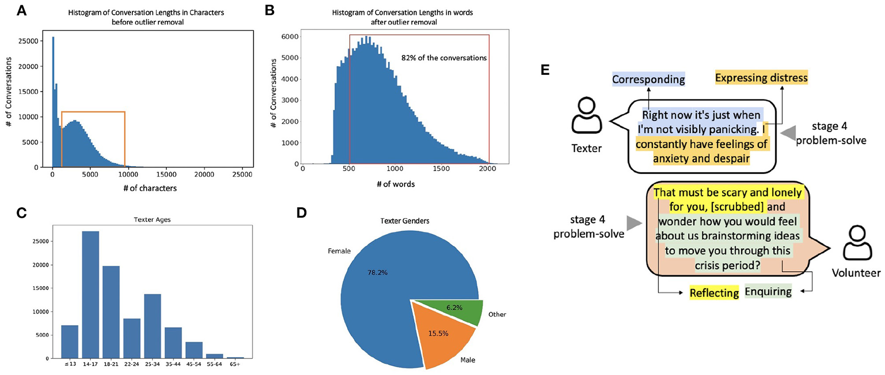 High-level overview of the Shout data set. (A) The distribution of conversation lengths as measured by the number of characters. The red box indicates the conversations between 1,200 and 9,200 characters which passed the inclusion criteria for analysis. (B) The histogram of the number of words in a conversation. Since 82% of the conversations exceed the maximum word limit (512 words) of traditional BERT-style NLP models, we use the Longformer model. (C) Age distribution and (D) gender distribution of texters as obtained from the texter surveys (which we show in section 3.3 to be biased toward particular demographic groups). (E) A synthetic example of a portion of a conversation to illustrate annotations of behaviours and conversation stages.