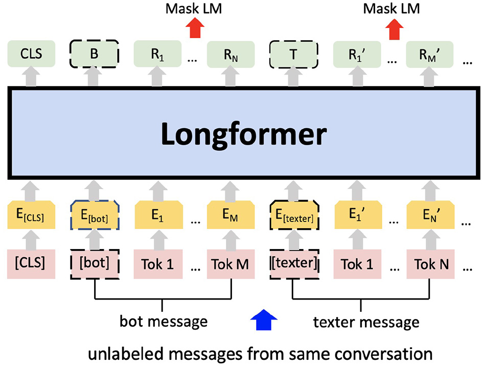 Additional pre-training on the masked language modelling (MLM) task using Shout mental health data. E represents the input embeddings. Ri represents the contextual representation of token i. B and T are the contextual representations of special token [bot] and [texter] respectively. After the tokenisation the numerical vectors are processed via Longformer.