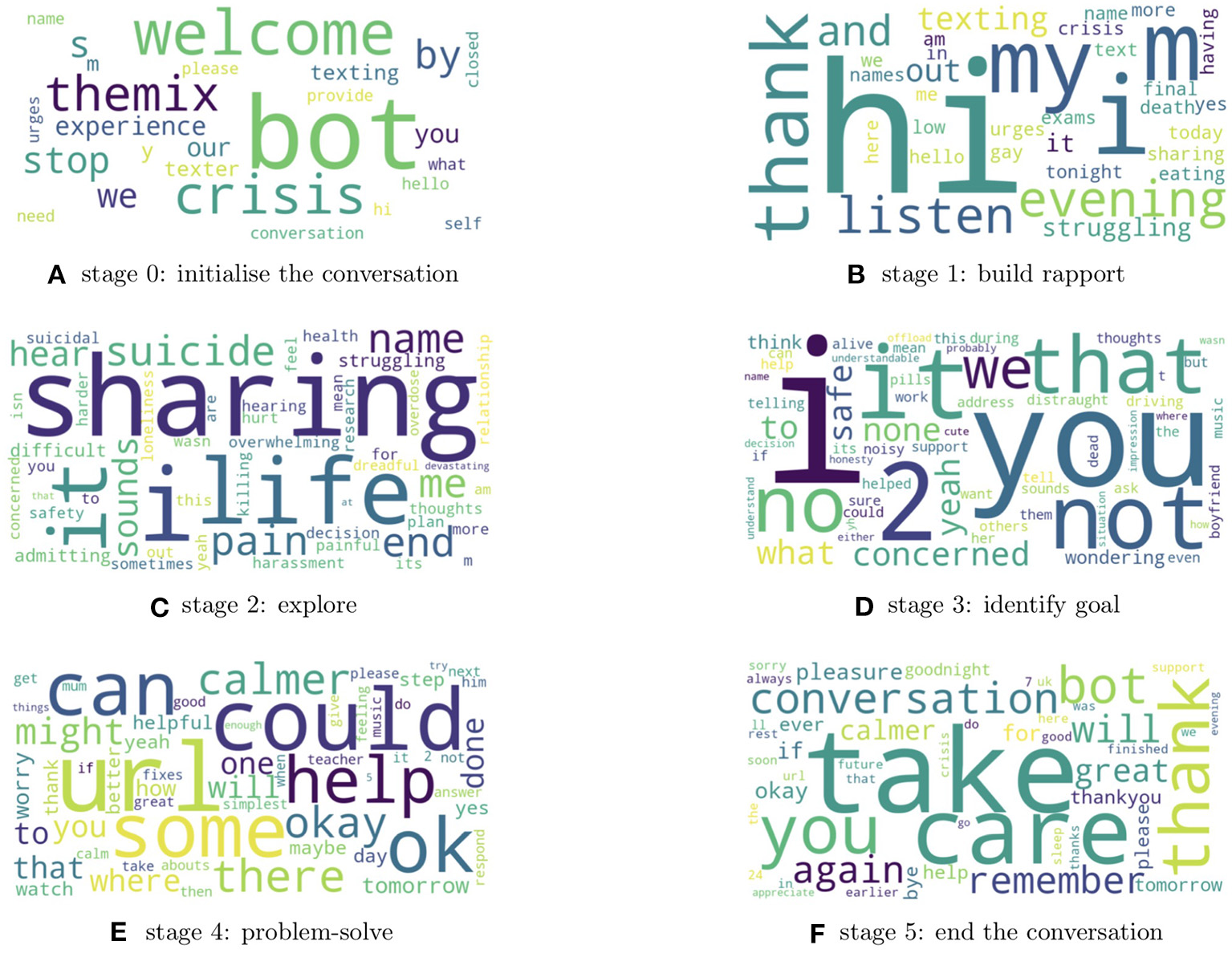 A subset of 169 conversations (8,844 messages) was randomly selected from the 271,445 total conversations and annotated at the message level to indicate the corresponding “conversation stage.” The annotation was performed by the Shout Clinical Supervisor and research psychologist, according to the definitions of each conversation stage established by Shout to train Volunteers. Each message belongs to one of six conversation stages listed in Table 1, with stage 0 incorporating preliminary engagement of the texter with the Shout service and automated bot, and stages one to five comprising the conversation with the Volunteer.