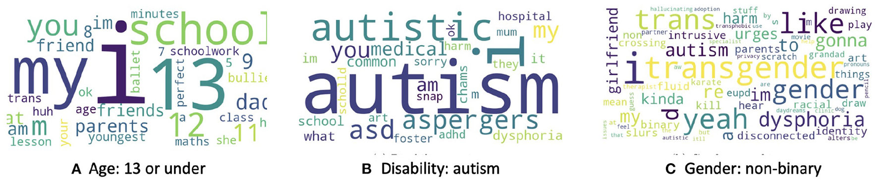 Here, we focussed on three classification categories, namely (1) self-declared autism diagnosis; (2) self-declared non-binary gender; (3) aged 13 and under. These were chosen to both understand mental health needs in the population, and help Shout identify use of their service by groups for whom more tailored support and resources may be warranted.