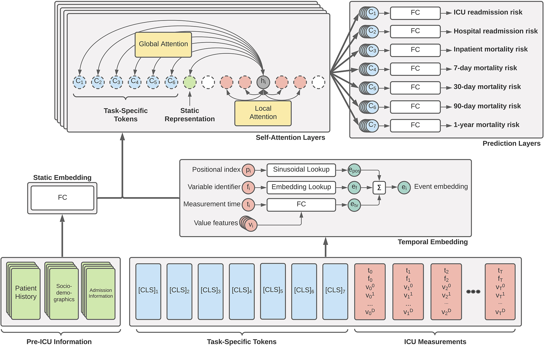 In contrast to recent Transformer approaches that either use discrete medical concepts (14–16) or continuous measurements from a handpicked set of features (17), we introduce a data embedding scheme that jointly captures both concept and corresponding measurement values of a wide variety of disjoint clinical descriptors.